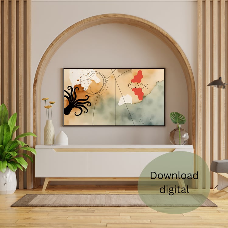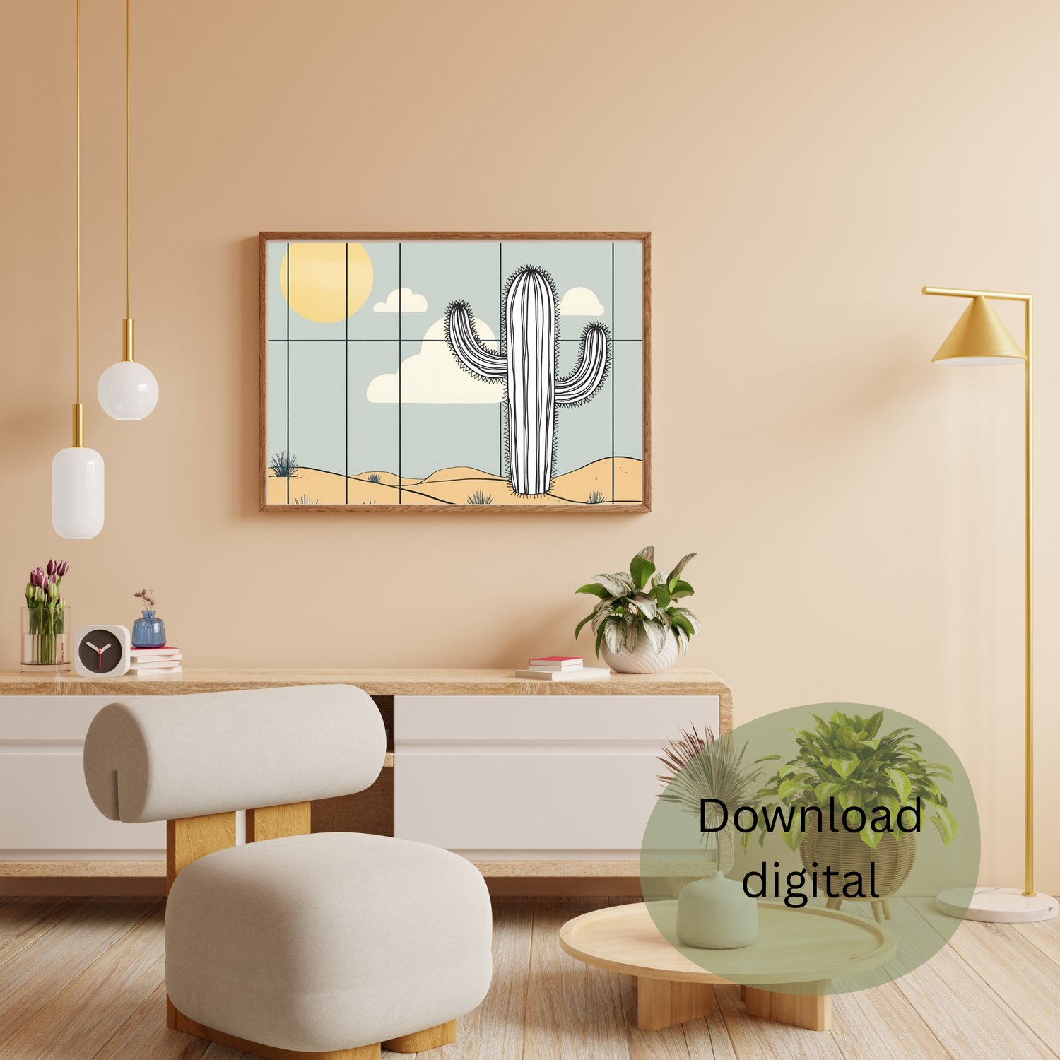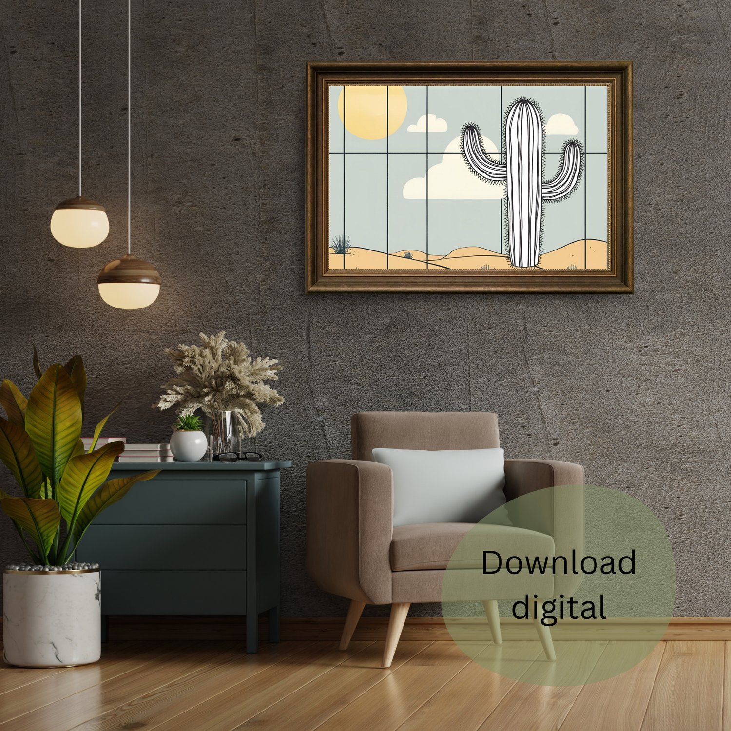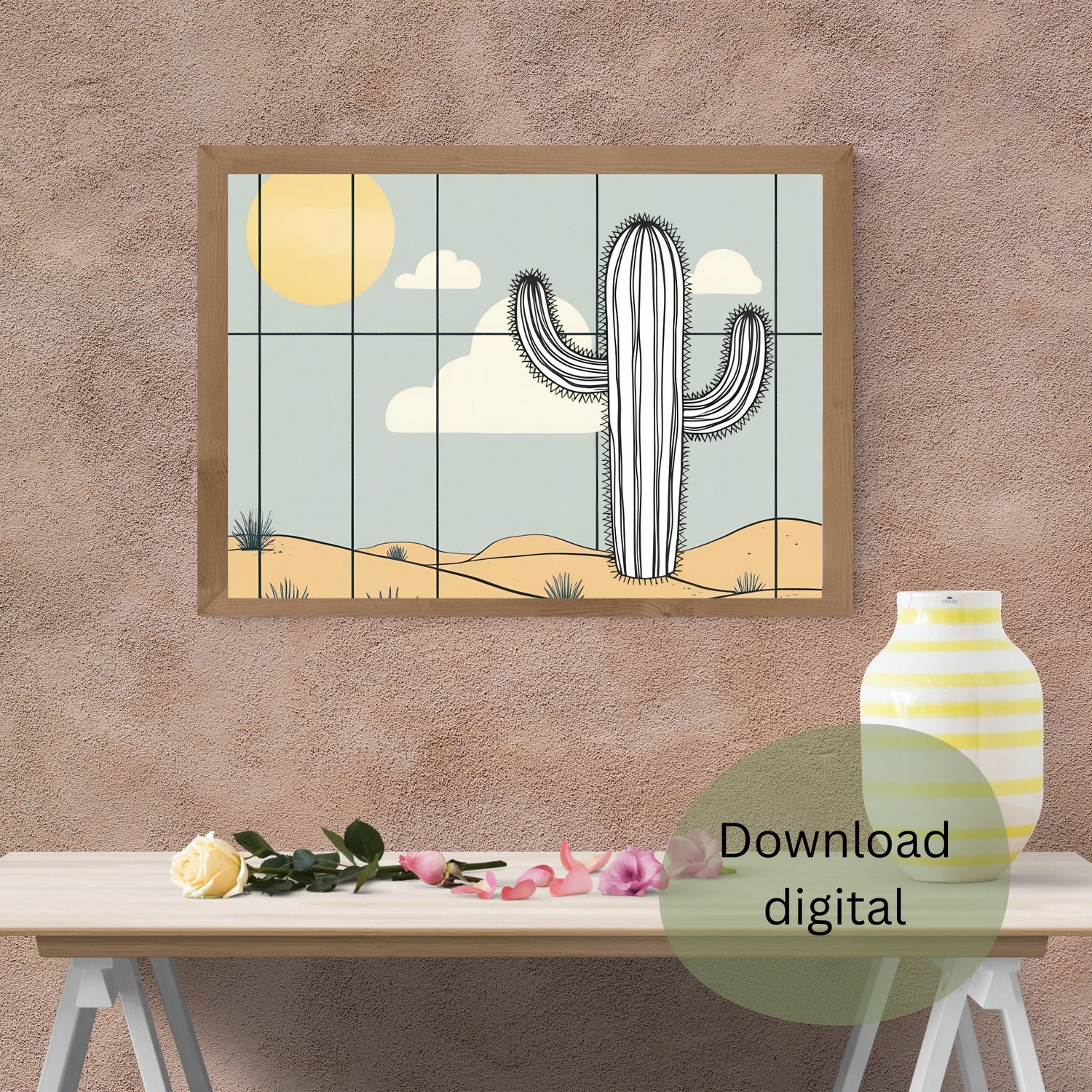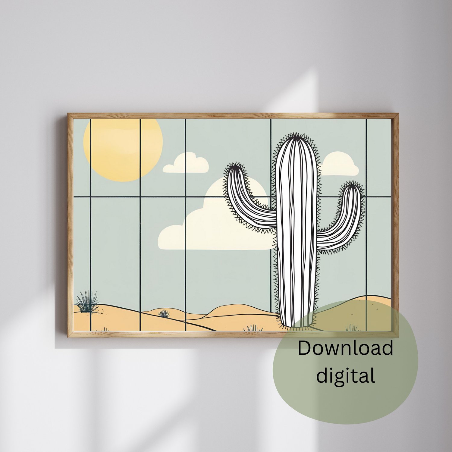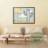 Transforma o teu espaço com esta elegante ilustração digital de um cacto no deserto, combinando um design moderno e minimalista com tons suaves e naturais. Ideal para qualquer divisão da casa, seja a sala, o quarto ou até o escritório, esta arte adiciona um toque de serenidade e sofisticação ao ambiente.