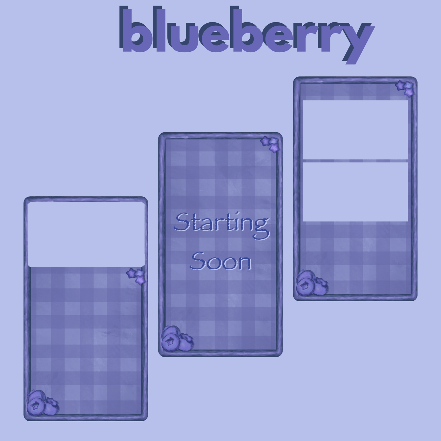 Upgrade your stream with this blueberry stream overlay pack, designed for creators who want a cohesive, eye-catching look. This set is perfect for streamers who love cute and soft styles and want their stream to feel polished and on-brand.
