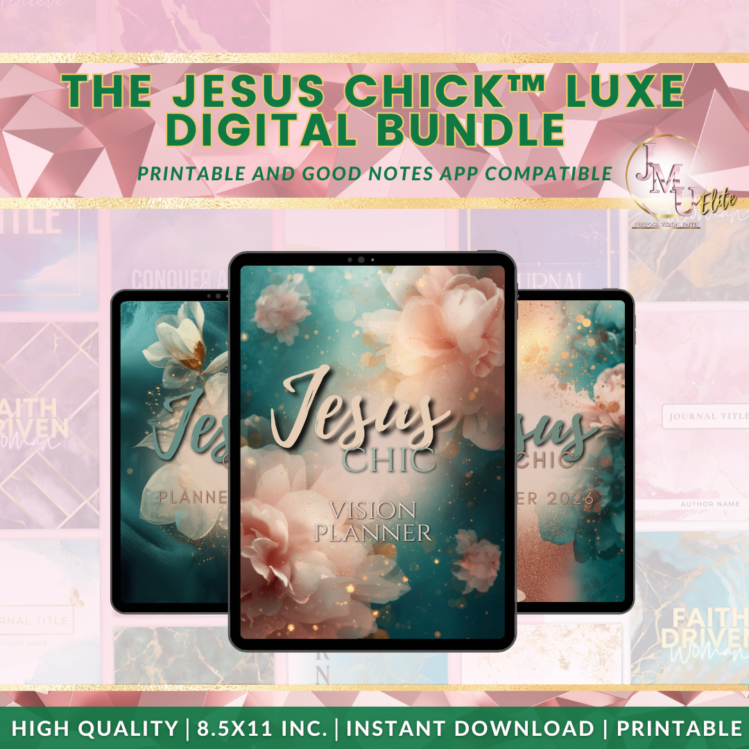 The Jesus Chick™ Digital Planner Collection — a faith-filled, feminine, chic digital bundle designed to help you reset, plan, and create with clarity. This private edition includes everything from the public release plus a premium bonus library reserved exclusively for Elite members.