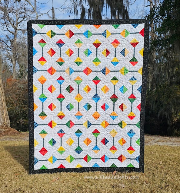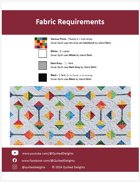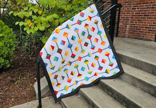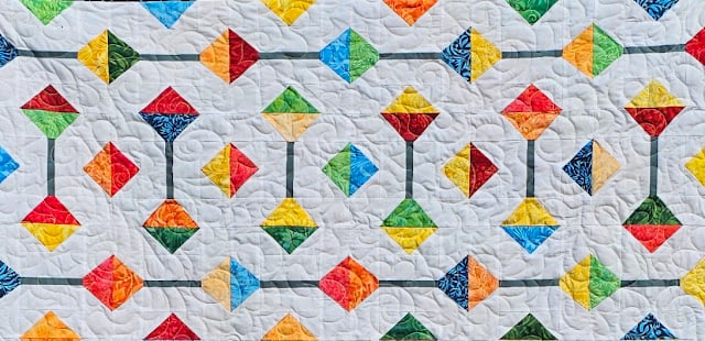 This quilt uses 2 1/2 inch strips to create a fun colorful lattice design. Templates are provided to create both the elongated triangle and the more traditional triangle.