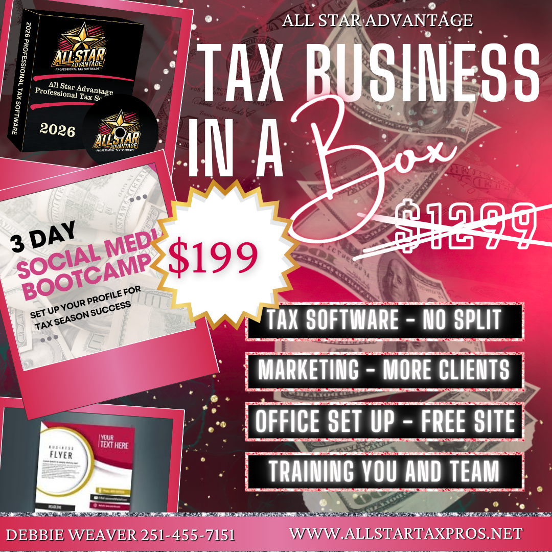 I'm beyond excited to officially roll out my Business in a BOX package β designed to help you launch, run, and grow your own tax prep business like a true BOSS.