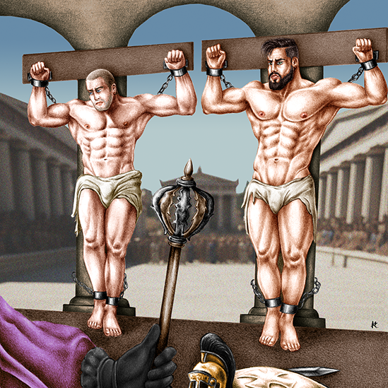 Main protagonist of my fantasy novel "The Cross of South", Romanus with his comrade Theodotus, together at a scene inside Romanus' tavern.