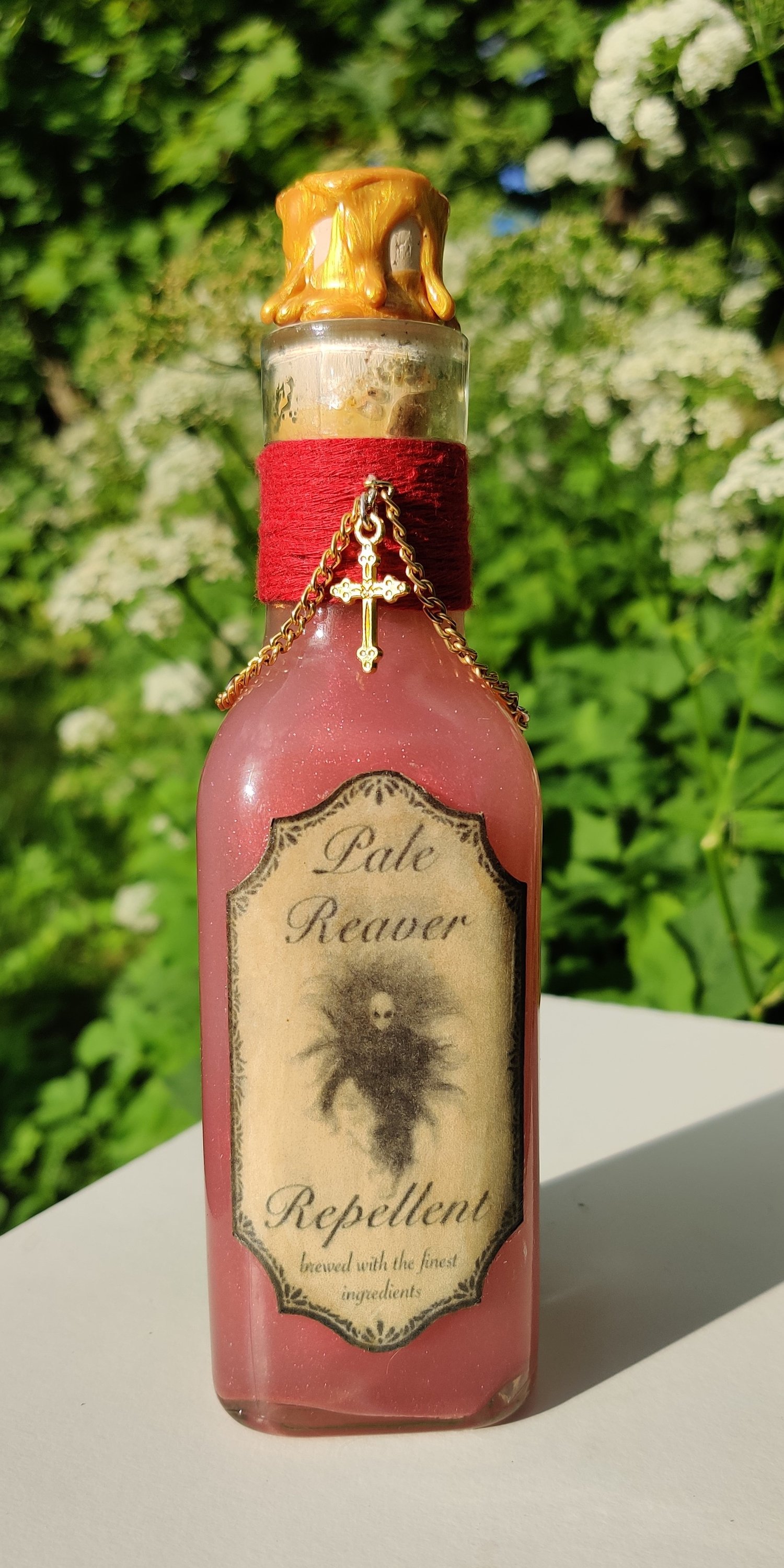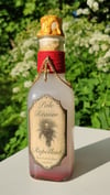 Pullossa on valkoista nestettä ja se on koristeltu käsintehdyllä etiketillä ja nauhalla sekä ketjulla ja riipuksella.