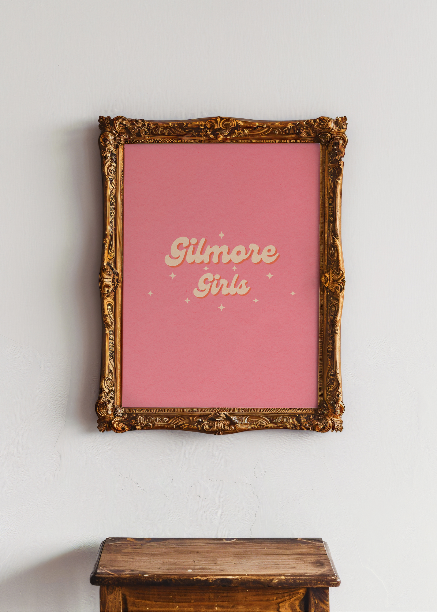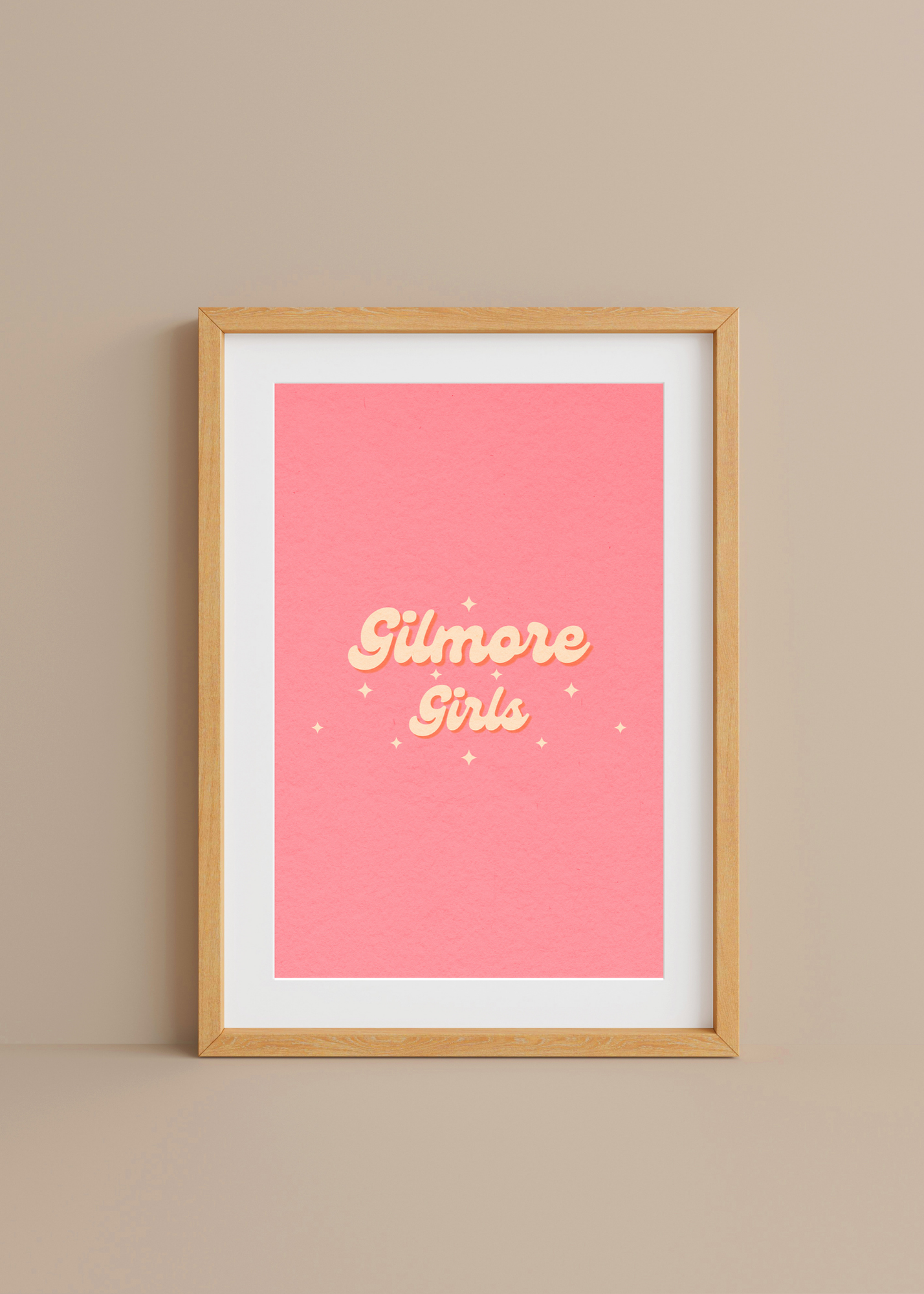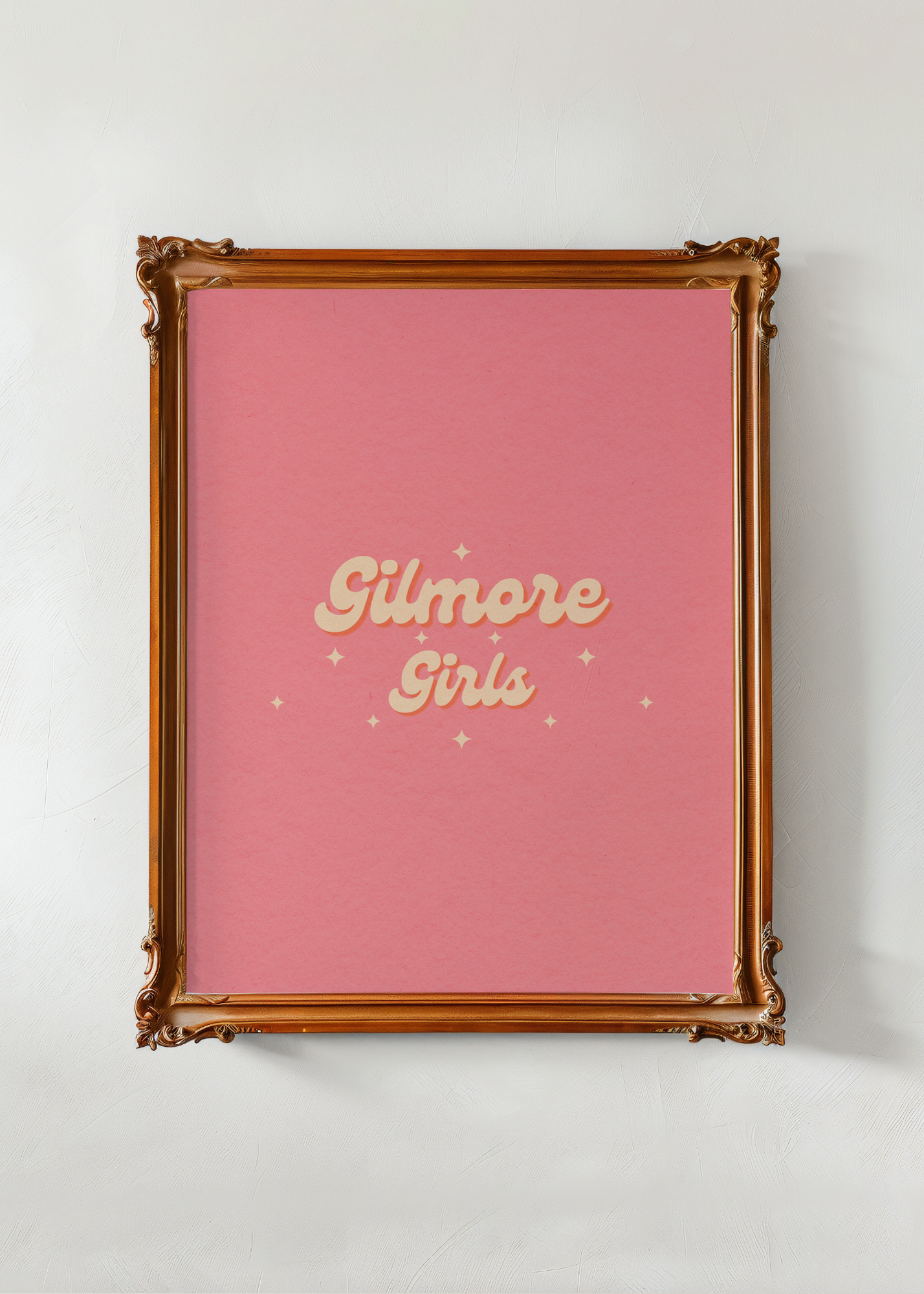 Gilmore Girls, Medium Pink— A playful nod to a beloved world, this original piece brings the spirit of Gilmore Girls to life in a burst of color and charm. Set against a bright, cheerful backdrop, the iconic words shine in a fun, modern font—simple, bold, and full of heart. Whether it evokes cozy nights, fast-talking scenes, or small-town magic, this design offers a vibrant tribute to the stories we return to again and again. Available in a variety of joyful hues to suit every mood.