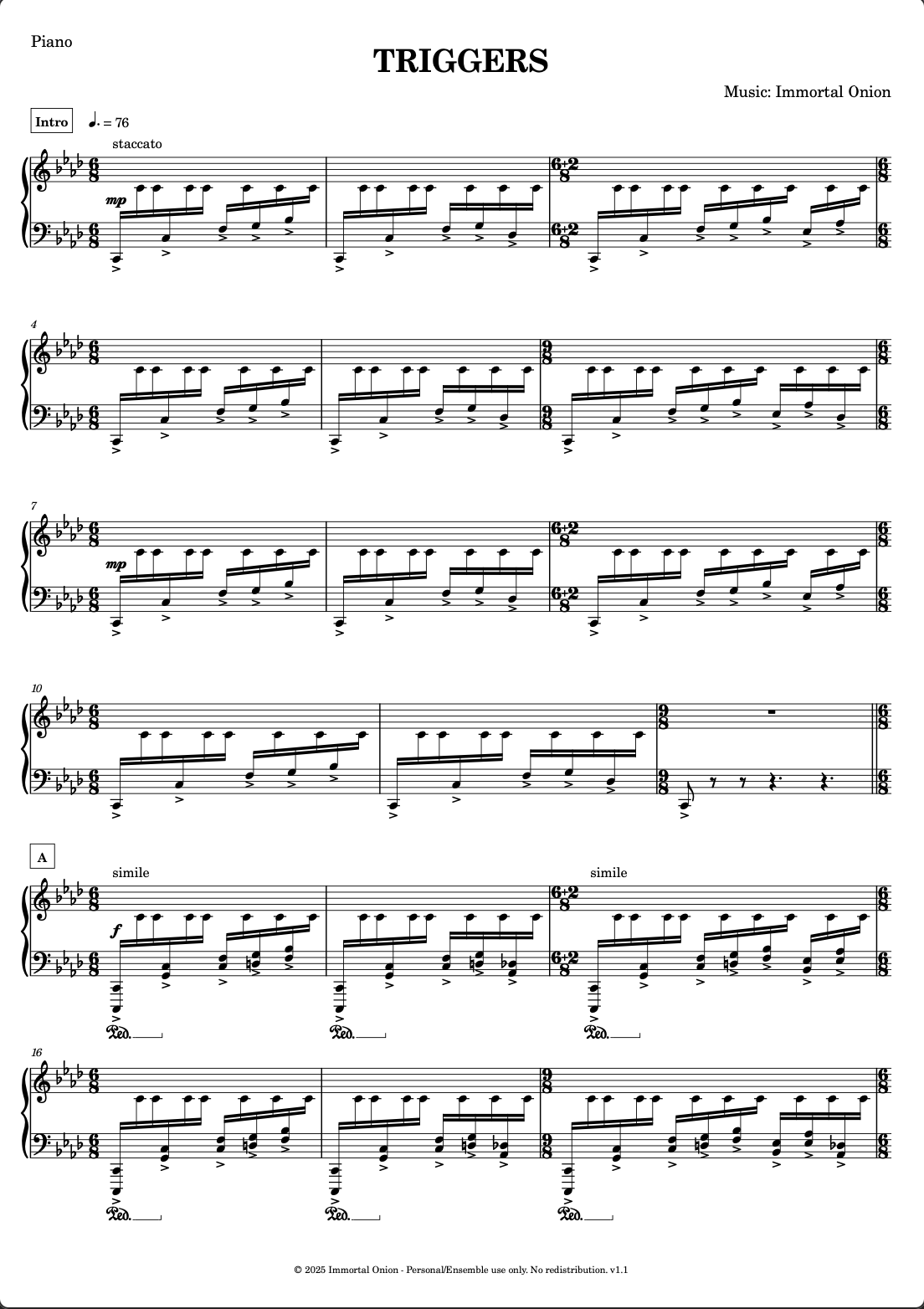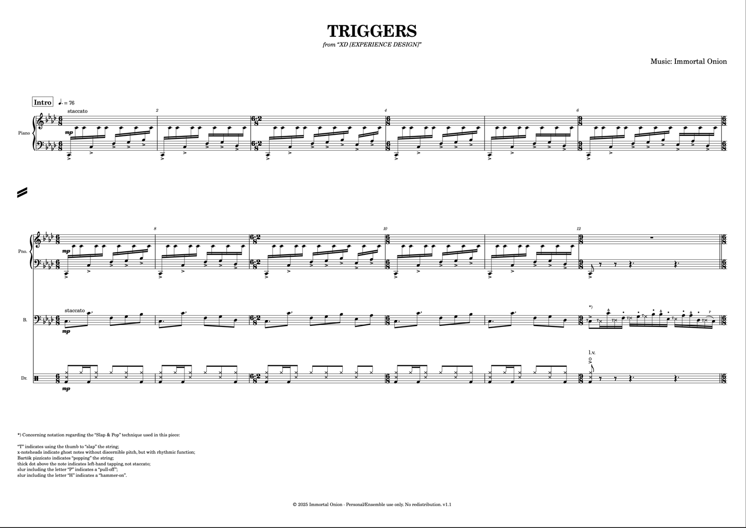 Explosive, rhythm-forward and cinematic: this is the official score to “Triggers,” arranged straight from the album version and prepared for real-world rehearsal and stage use. Clean engraving, clear cues, and page turns that won’t fight your flow. Whether you’re tackling the full trio or shedding a single part, this edition keeps the groove tight and the details readable both on print and on screens.