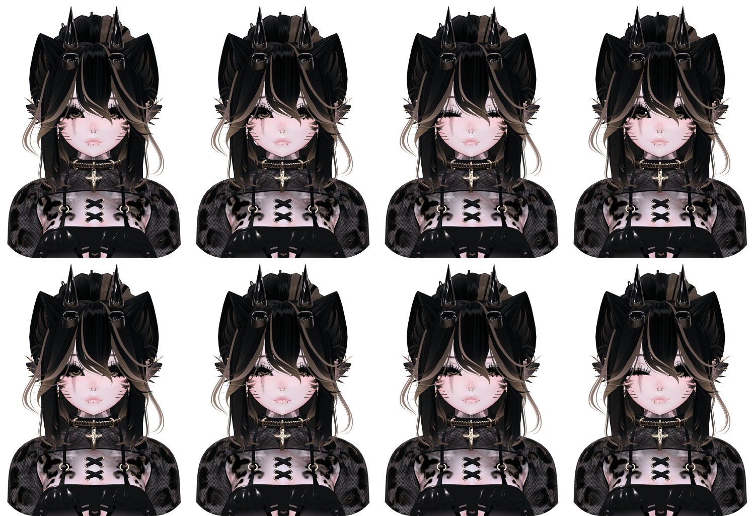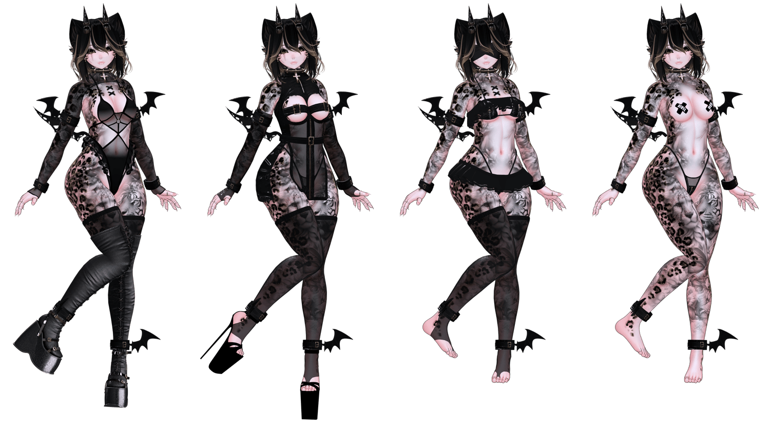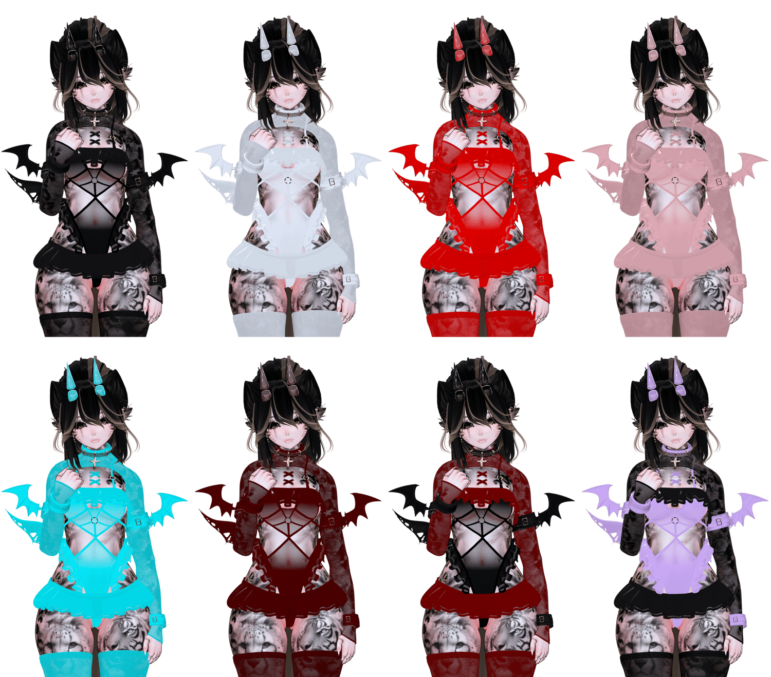 - (BLACK & WHITE TOGGLE ONLY!): TOP & STOCKINGS | BODYSUIT | SKIRT | DRESS & GLOVES | BRA & PANTIES | LACE & PASTIES | SHOES & HEELS | BLINDFOLD & COLLAR | ALL WINGS | HORN & TONGUE METAL