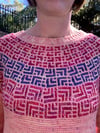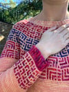 The Tesserae Jumper is a top down jumper worked in the round in Tunisian Crochet. A geometric mosaic pattern is worked around the yoke, the base of the torso and the base of the sleeves. All the cuffs on the jumper are made in standard crochet. The fit of the jumper is customisable with steps in the pattern included for how to do this.