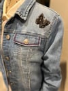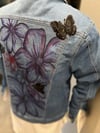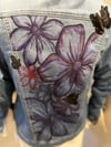 This Buffalo/David Bitton size S/P designer jacket is just adorable. It features a lace butterfly on the front left shoulder as well as three more on the back. Exclusive handpainted florals, by artist Jenn Hunt, adorn the center back panel in beautiful shades of purple and pink. Purple accents on the pockets, and a few black rhinestones adorn the butterflies. This is a medium-weight-density fabric. It has upper chest pockets only.