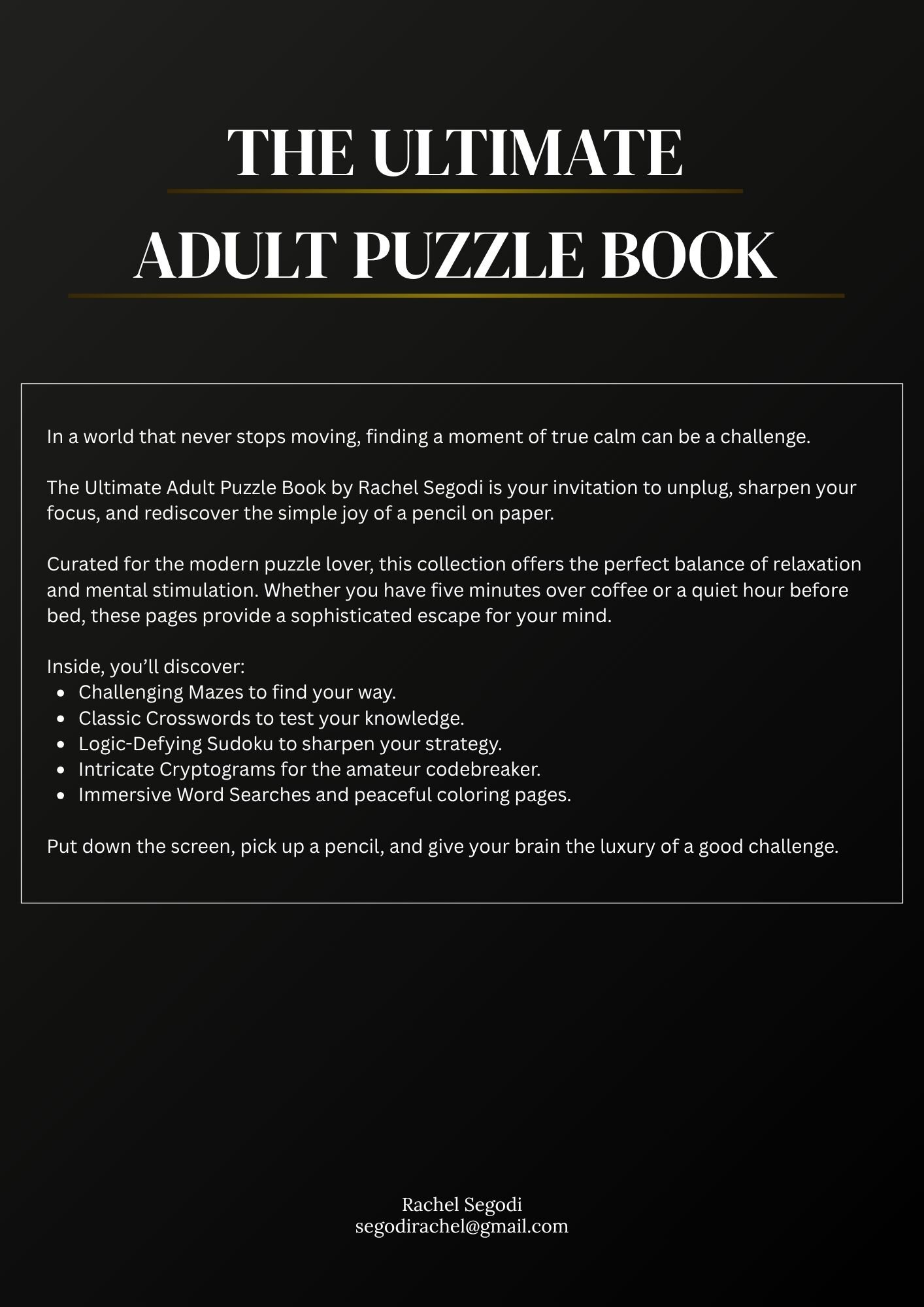 Step into a world of focus, fun, and mental clarity with this beautifully designed Ultimate Adult Puzzle Book by Rachel Segodi, created for those who want to relax while keeping their minds sharp.