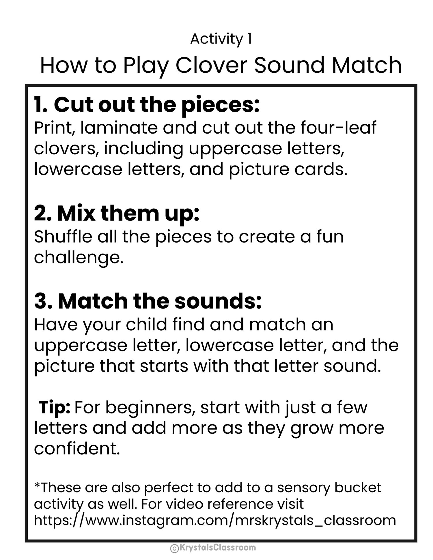 • Activity 2: Clover Sound Fill-In – Take it a step further by matching letters with the correct picture to complete the sound pattern. Great for developing both letter and sound association!