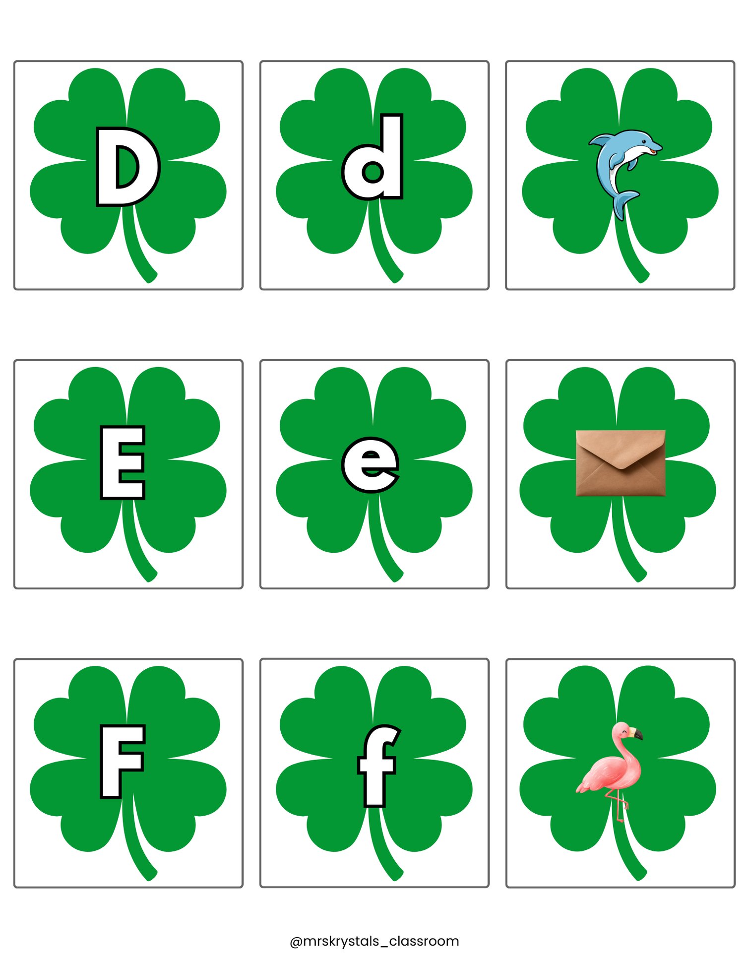 • Activity 1: Clover Sound Match – Match uppercase and lowercase clovers with pictures that start with each letter sound (w the exception of /x/ -has ending sound for accuracy). A perfect activity to reinforce phonics skills.