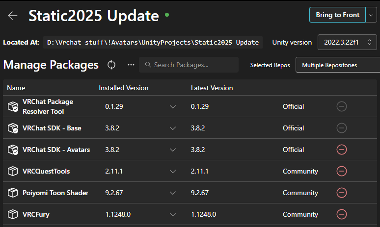 Make a new avatar 2022 project in VCC -> Add Quest Tools + Poiyomi Addon + VRCFury -> import Avatar Unity File