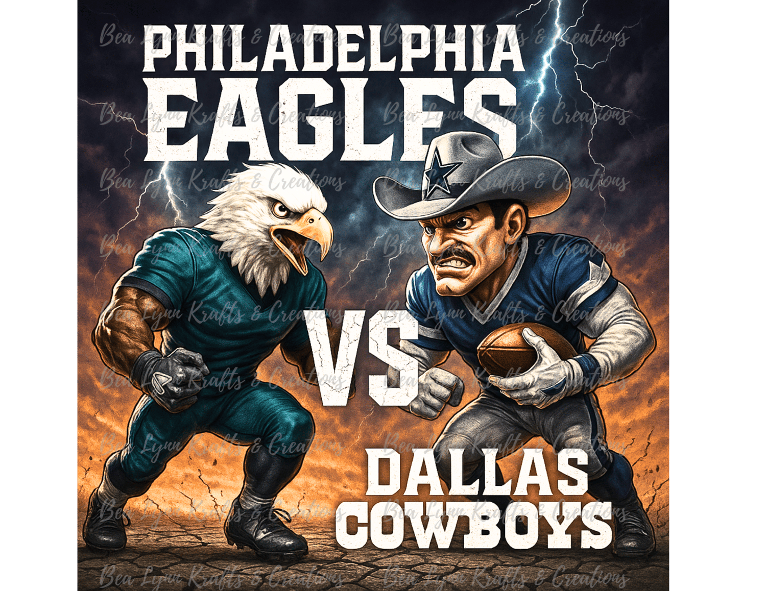 Get ready for one of the most intense rivalries in NFL history with this electrifying Eagles vs Cowboys transparent PNG! The design features a jacked-up Philly eagle and a gritty Dallas cowboy locked in battle — fists clenched, lightning cracking, and tension high on a stormy turf. This graphic captures the fire, grit, and heart of every fan who bleeds green or rides with the star.