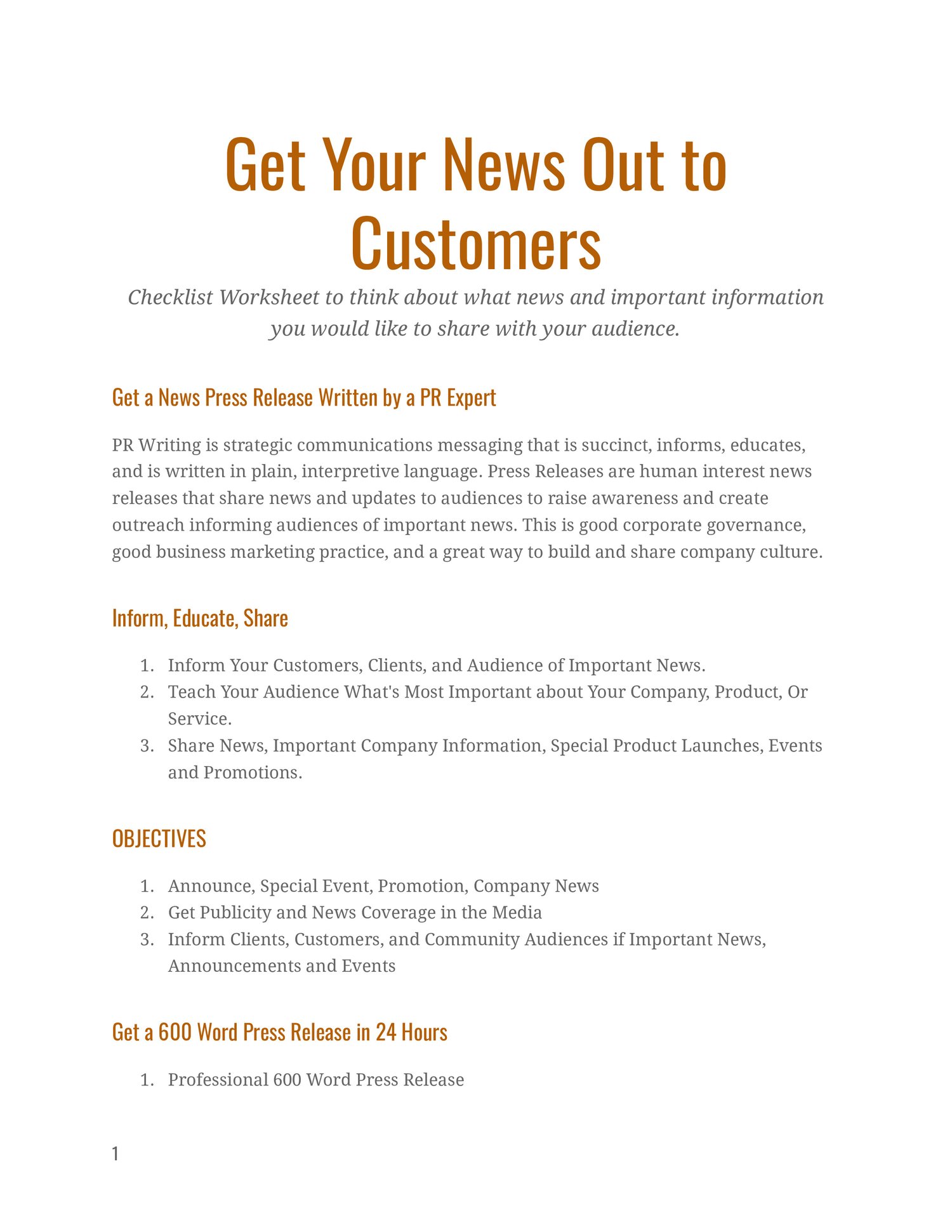 Announce Your Company News Coaching worksheet and checklist gives your the right guidance to write out your news each month. It's a reminder to announce important company news. Plus Pricing options with Press Release Included.