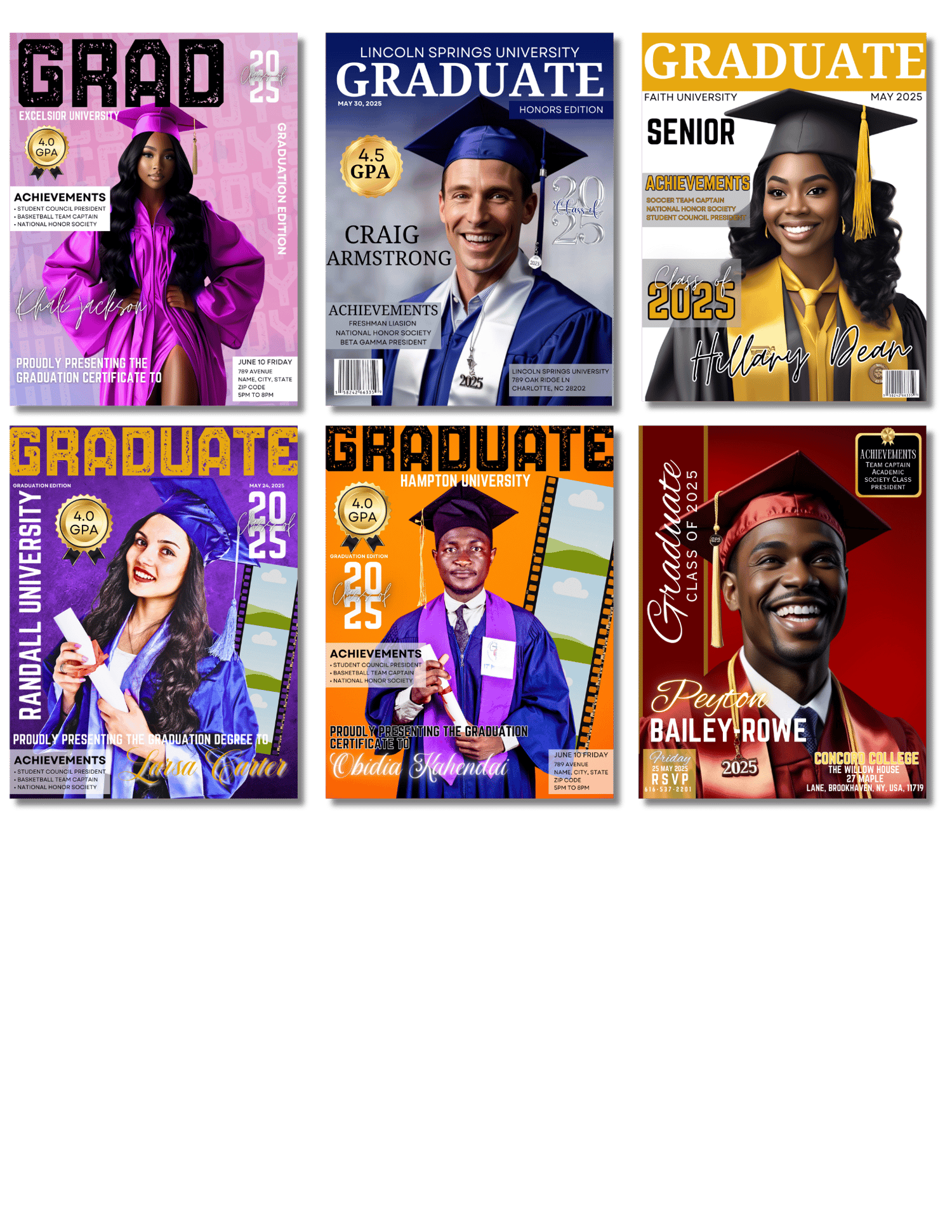 This Canva editable template comes with 6 different magazine covers that can also be used as an invitation. Simply download, make a copy, and change info to your desired wording, change pics, colors, etc. Make it your own. It's simple and easy to edit in Canva.