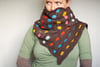 Worked in any weight yarn, with a simple construction for the asymmetrical triangle shape, this relatively easy to knit piece is a great way to showcase a collection of different colored yarns. Pick one main color and as many contrasting partial skeins as you want, to make the dots in this slip-stitch colorwork shawl.