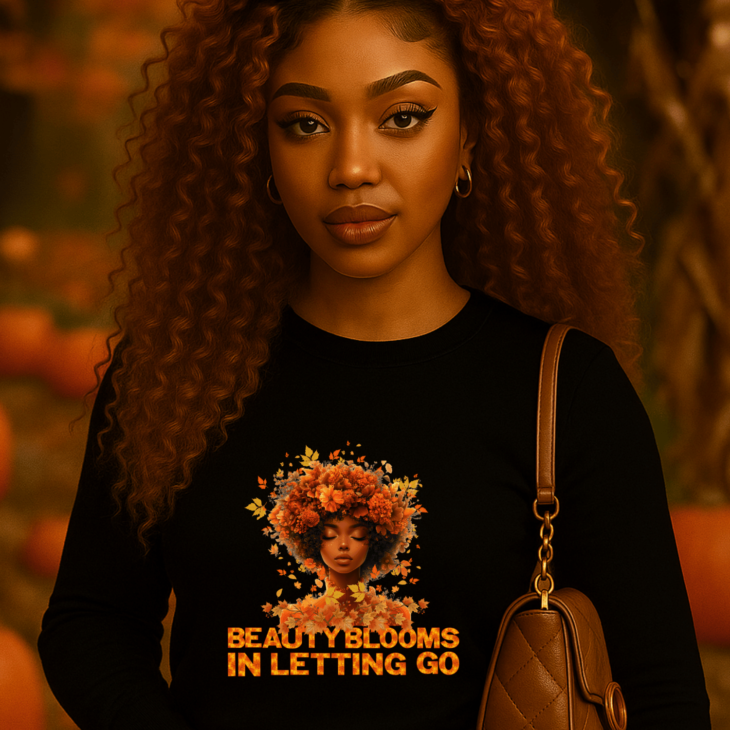 This Beauty Blooms in Letting Go PNG features a stunning Afro woman with vibrant fall flowers and leaves in her hair, paired with an inspiring quote in bold autumn lettering. Perfect for sublimation, heat transfer, and printable crafts, this design is ideal for T shirts, tumblers, mugs, notebooks, wall art, stickers, and more.