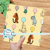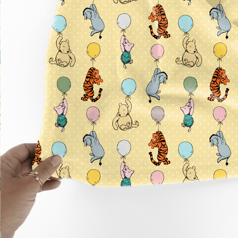 Classic Pooh storybook characters with floating balloons, including Eeyore, Tigger and Piglet.