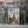 This stunning watercolor artwork captures the elegance and charm of the iconic Eiffel Tower. set against