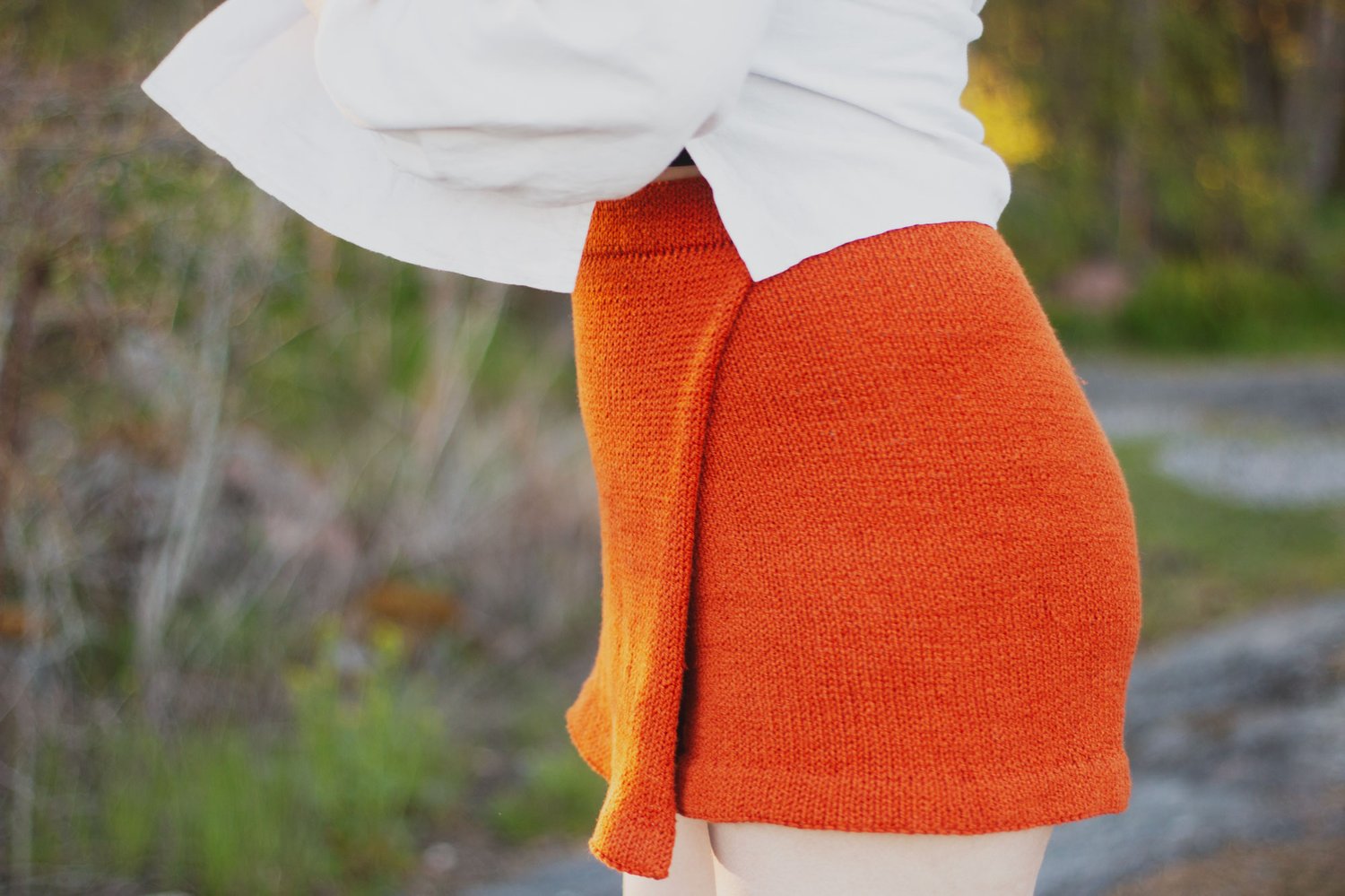 Vitamin skorts are knitted top down in the round. The back is shaped with German short rows, and increases are made in the front and back. The legs are then separated from the body and knitted in the round. You will pick up stitches from the waist to make the skirt flap, that will then be sewed to the side of the shorts.