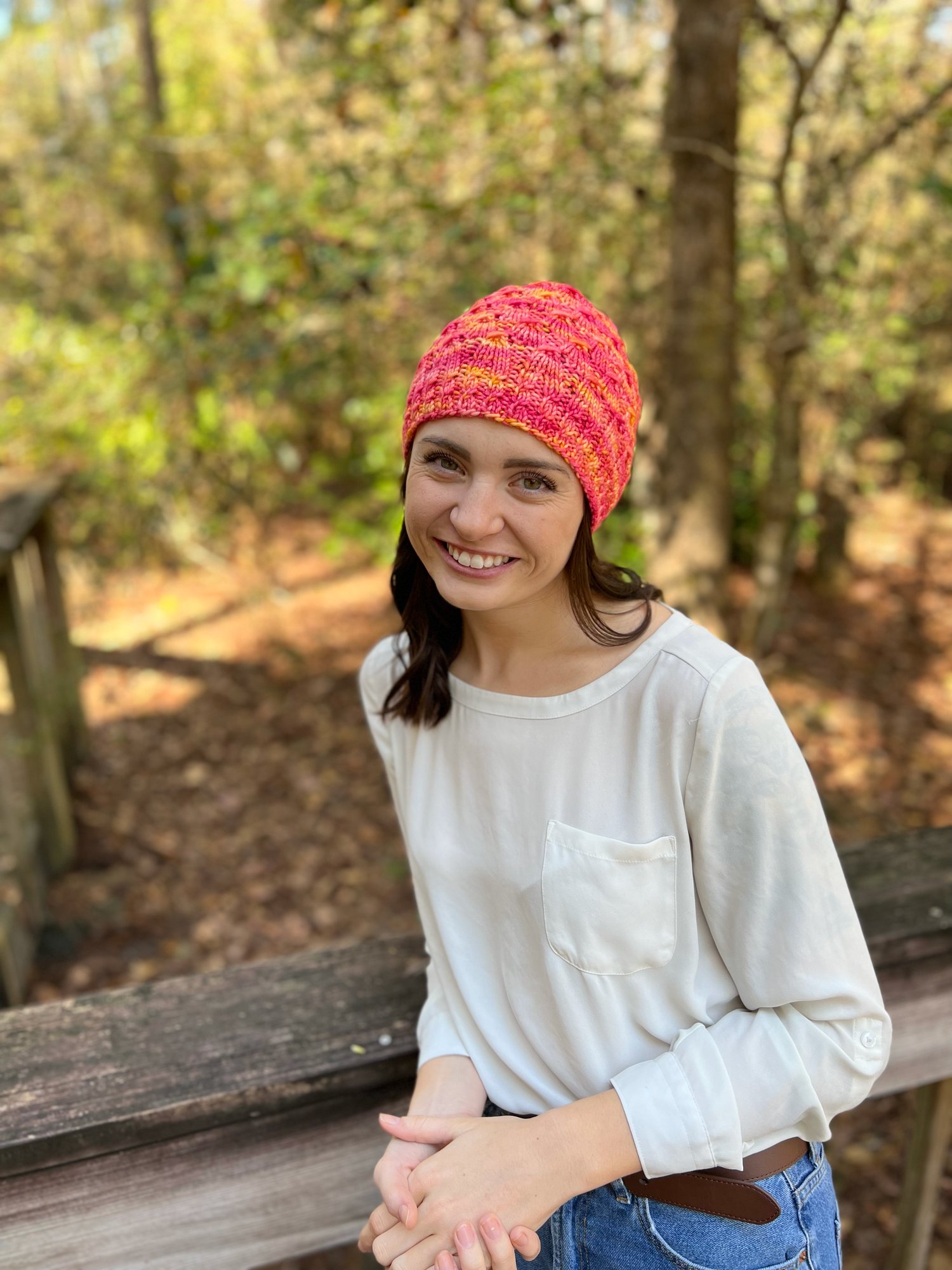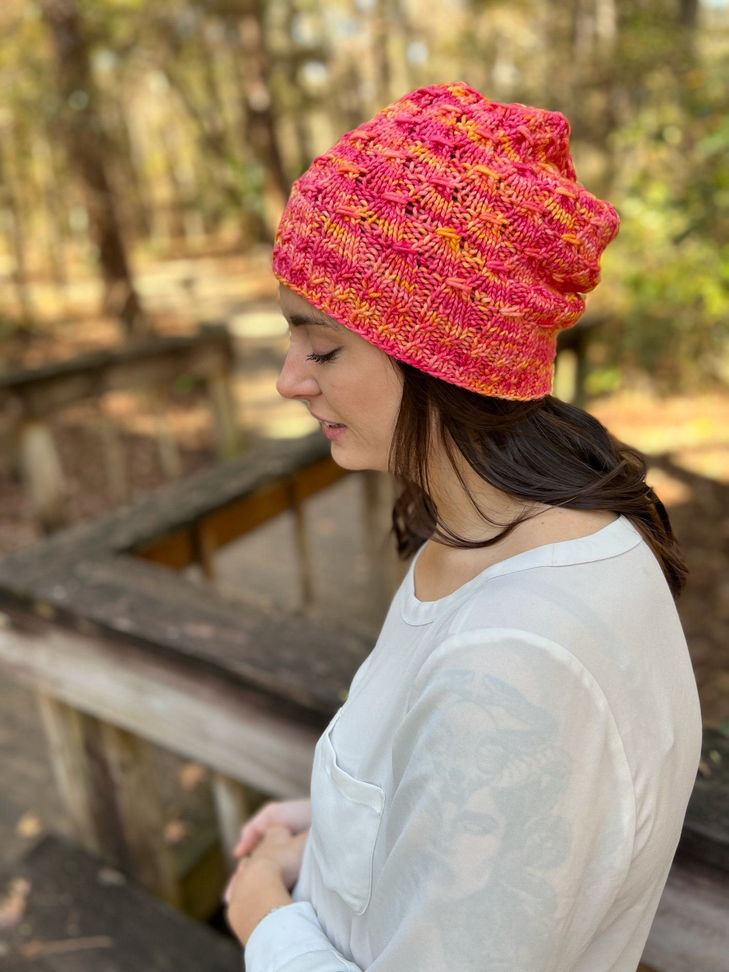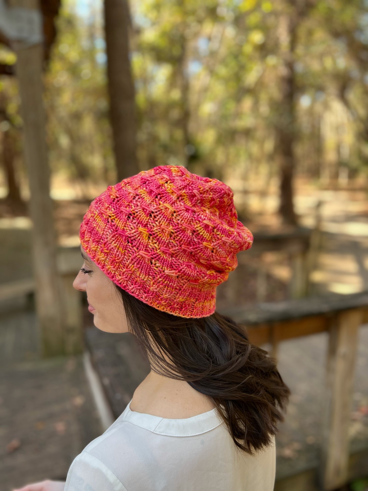 The Starburst Hat starts off with twist stitch cabling that flows into a loop stitch smocking that makes the most of this fun and flashy variegated colorway!