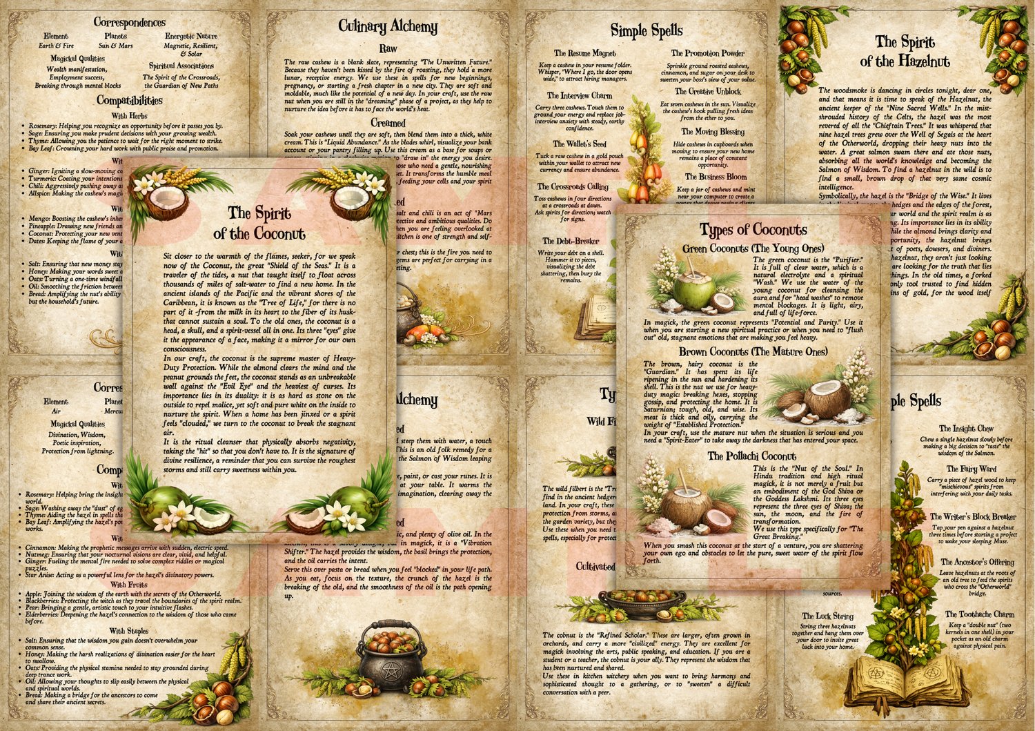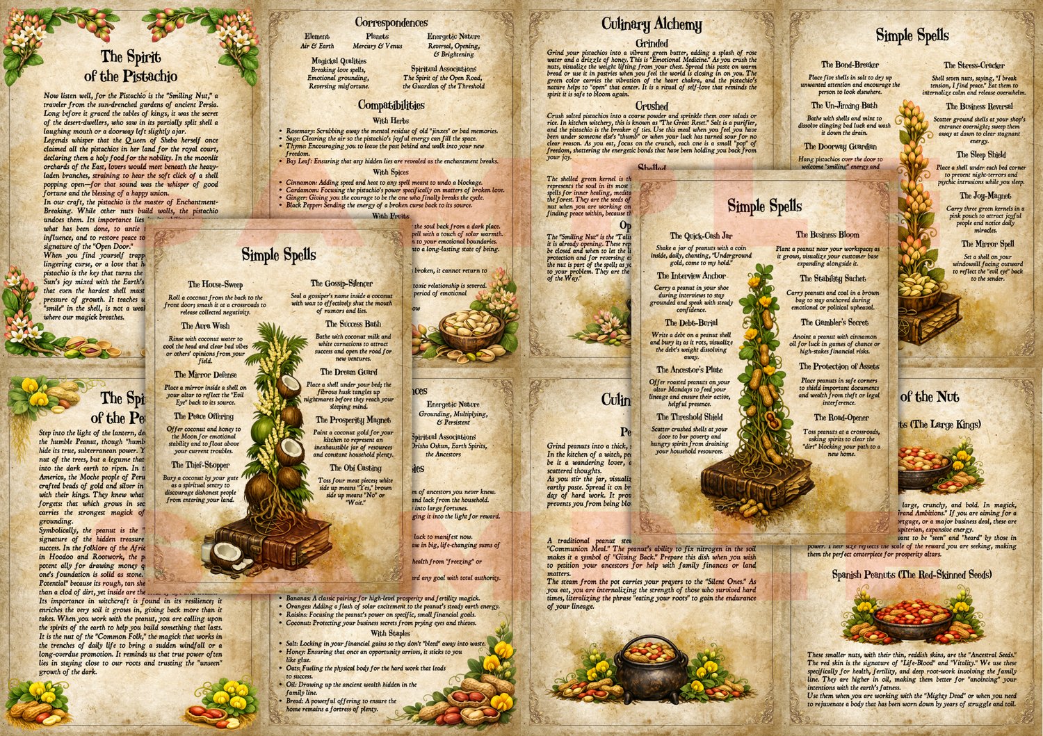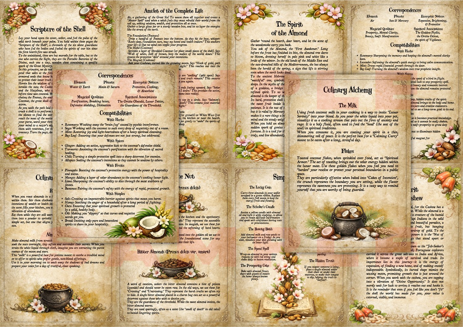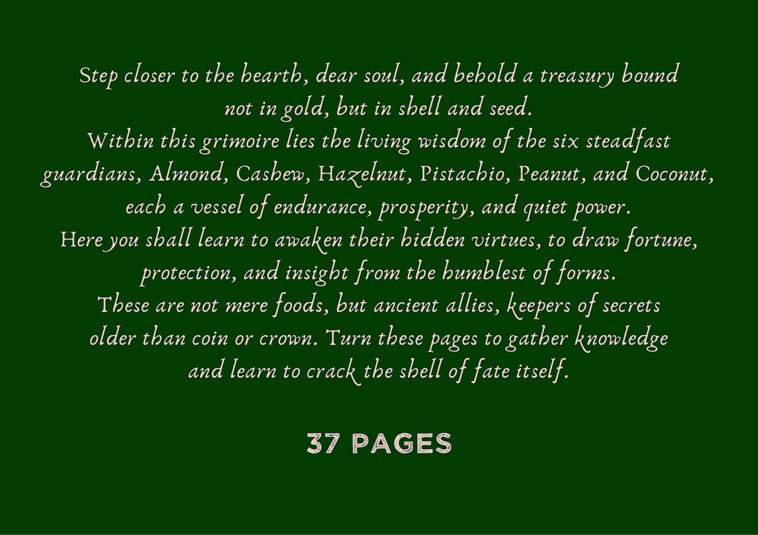 Within this grimoire lies the living wisdom of the six steadfast guardians, Almond, Cashew, Hazelnut, Pistachio, Peanut, and Coconut, each a vessel of endurance, prosperity, and quiet power.