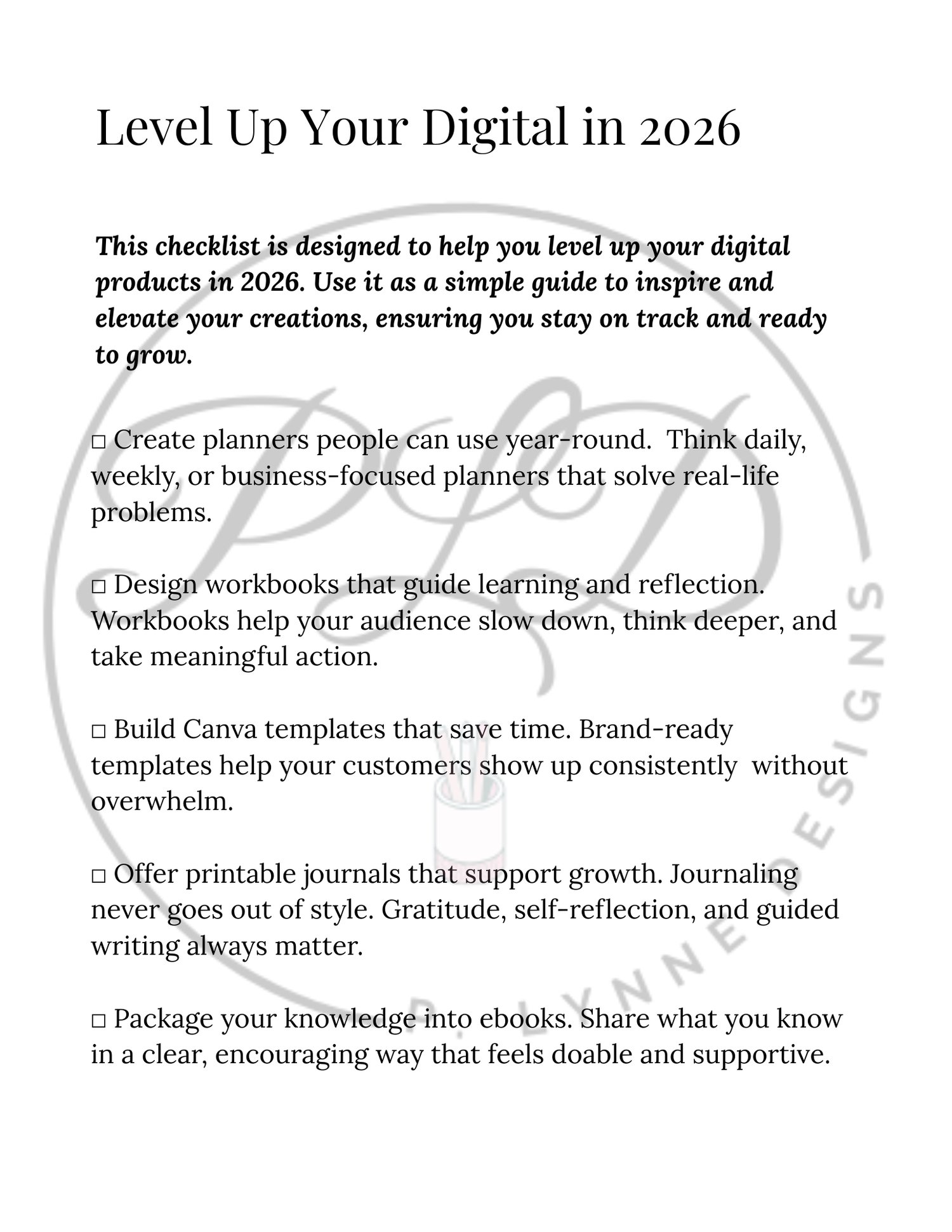 This one-page checklist is the perfect starting point for anyone looking to get serious about leveling up their digital products in 2026. It’s simple, actionable, and packed with the essential steps to help you create and sell your digital products.