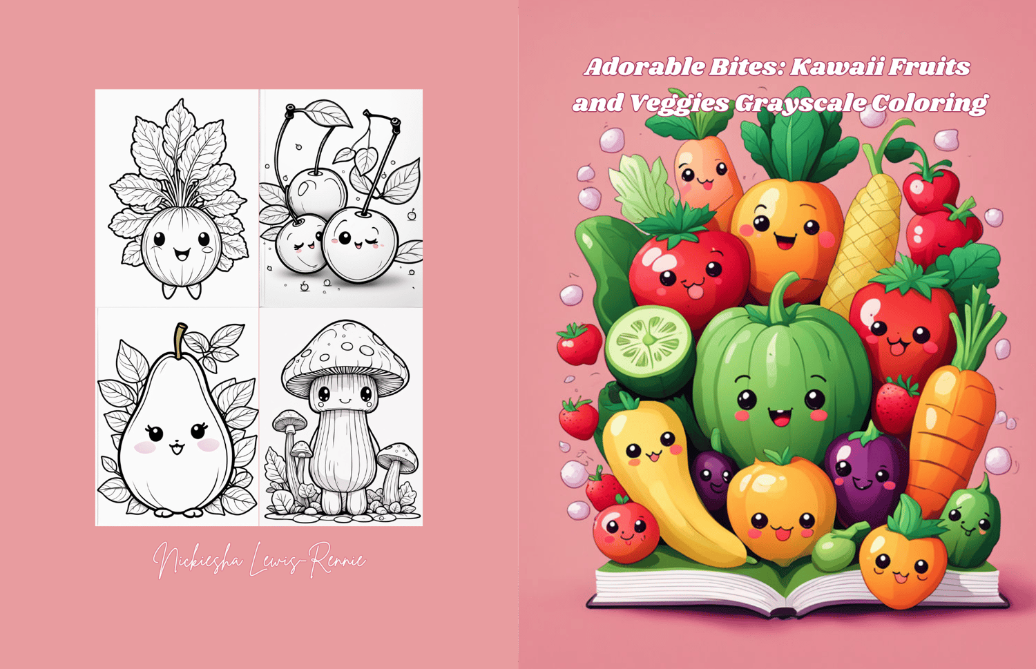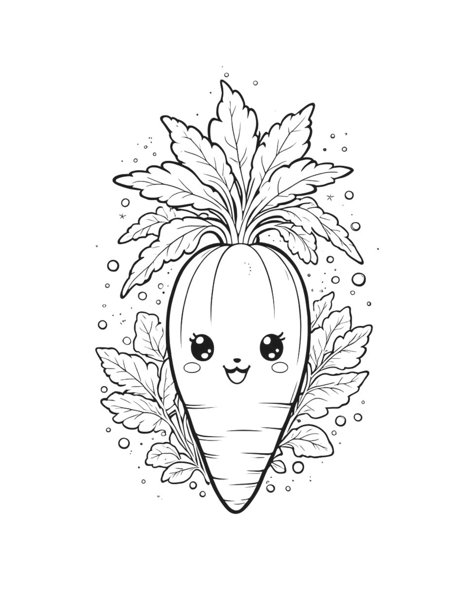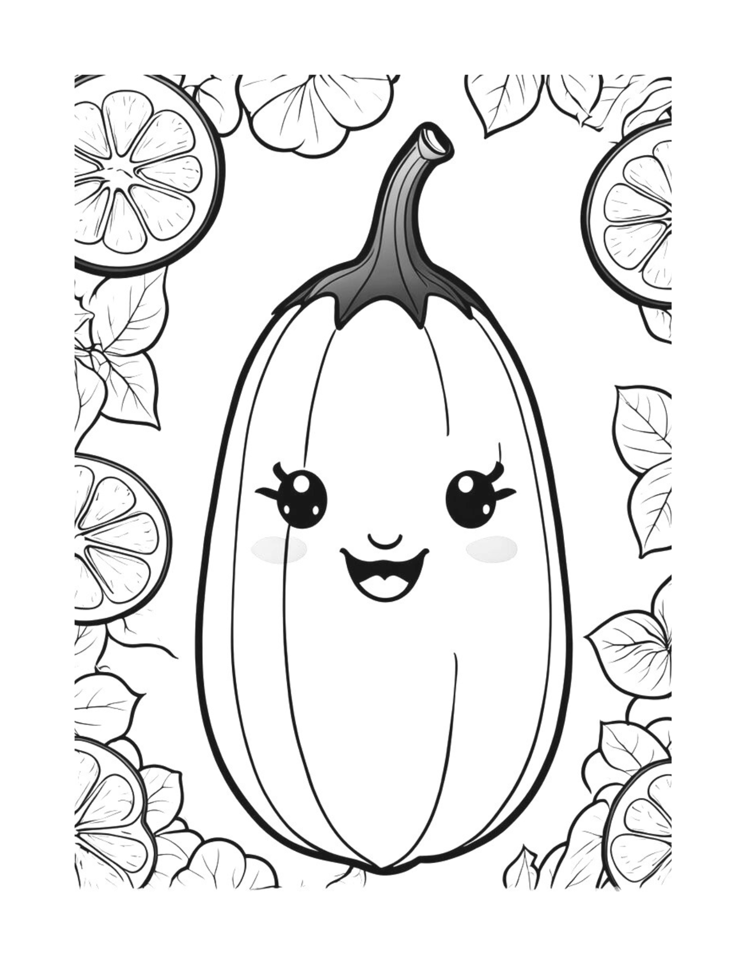 Adorable Bites: Kawaii Fruits and Veggies Grayscale Coloring: "Whimsical Delights to Brighten Your Day"