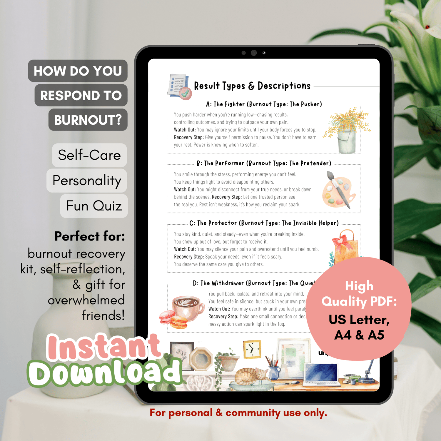 Designed for reflection, journaling, or self-coaching, this digital stress personality test is perfect for anyone navigating burnout, exhaustion, or emotional overload.