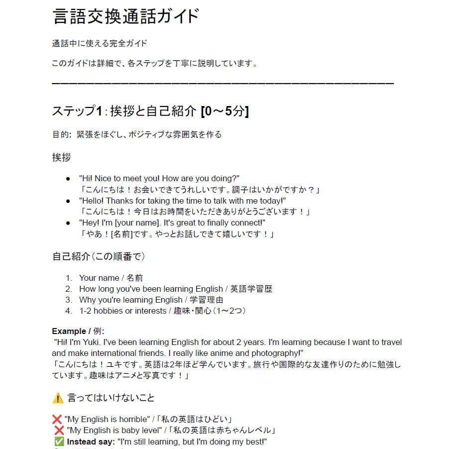 選択肢年間コスト問題点英会話スクール¥240,000〜360,000テンプレートもスクリプトももらえない言語交換アプリ有料会員¥60,000何を送るか、何を話すかは自分で考えるこのガイド¥2,499(一度だけ)✅ テンプレート、スクリプト、完全ガイド全て込み