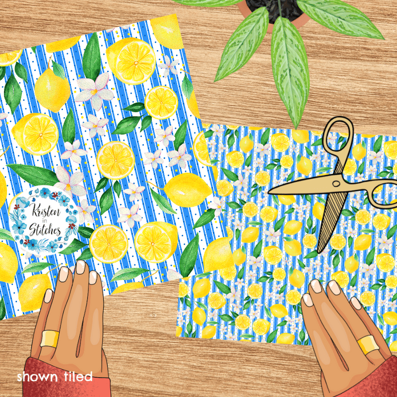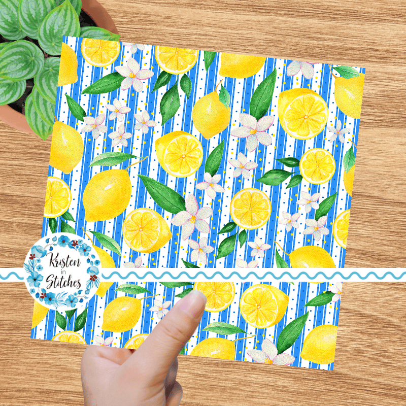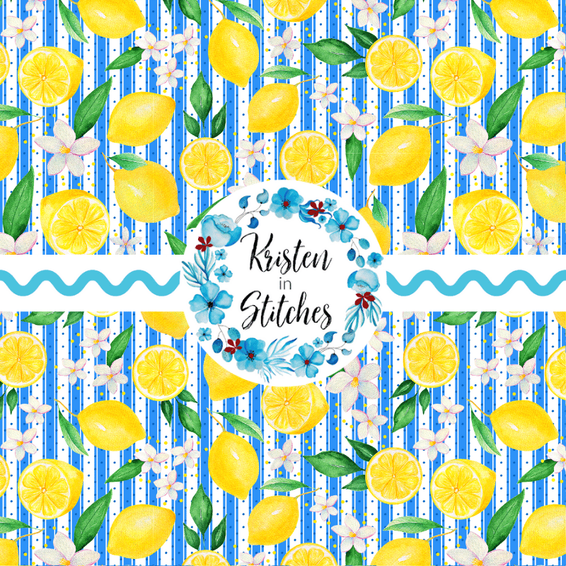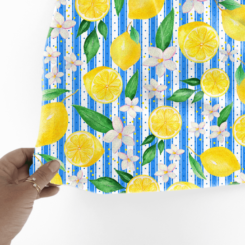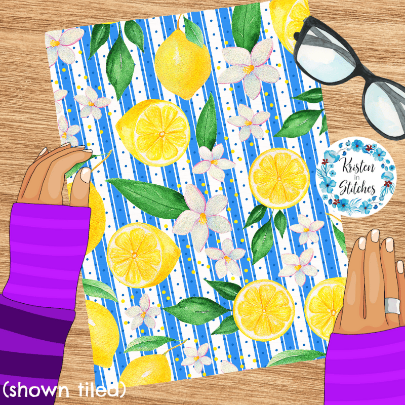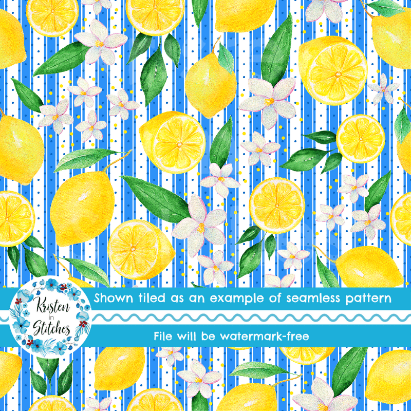 Yellow Lemon Citrus Fruit Floral Seamless Pattern, Mediterranean Blue Stripes