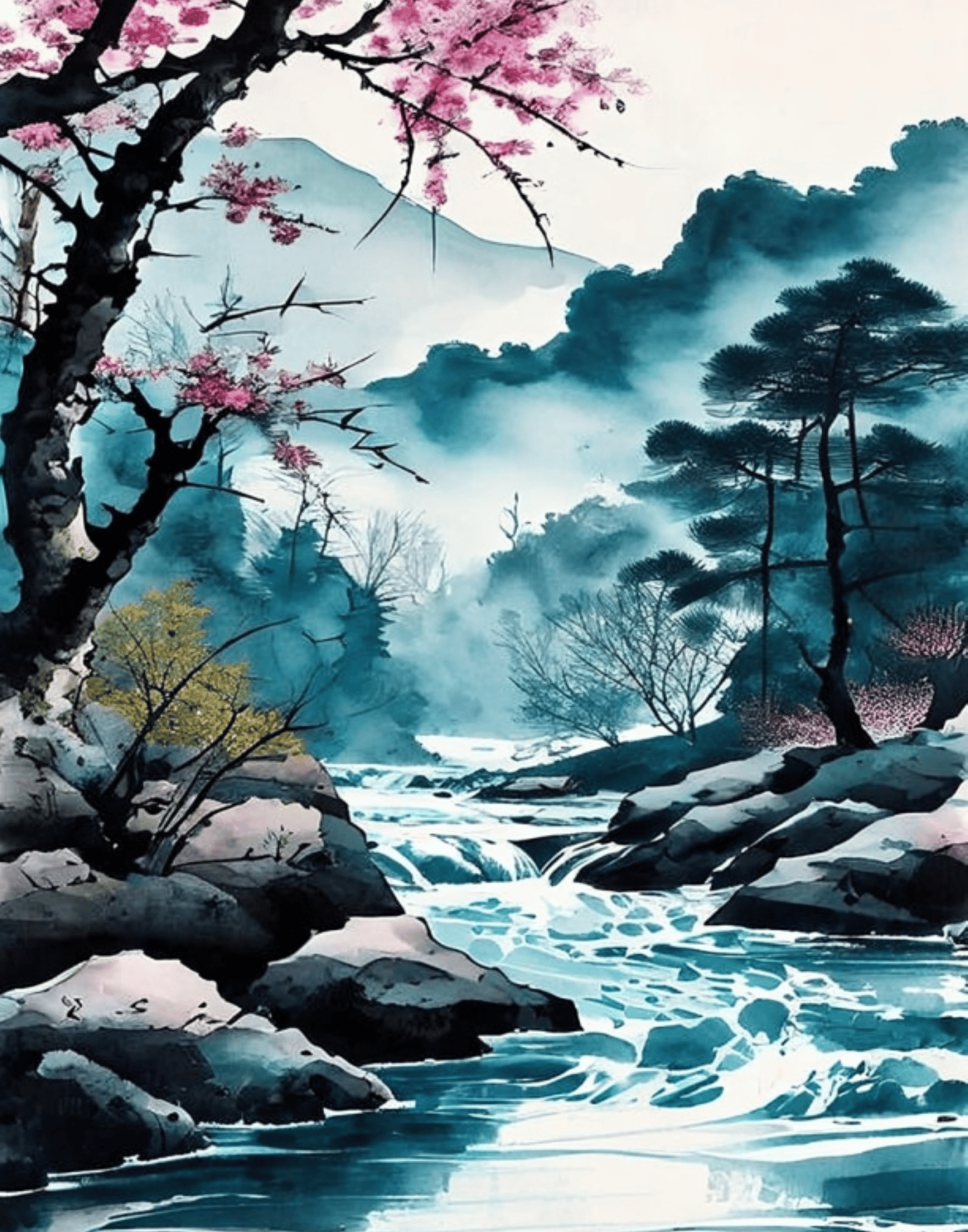 Japanese Painting, Vintage Japanese River, Modern Digital Art Style, Top Art, Nostalgic Rural life, Nature, Cool Nature, Beautiful Nature, Sunrise, Natural Landscape, Wall Art, Digital Art.
