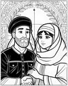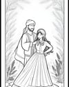 This artwork series depicts couples from different cultural backgrounds, showcasing diversity and cross-cultural relationships. The images portray couples in traditional clothing, set against symbolic backgrounds that reflect their heritage. The art style is black and white line drawings with intricate details.