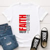 • Bold, vertical FAITH in red for a striking message
