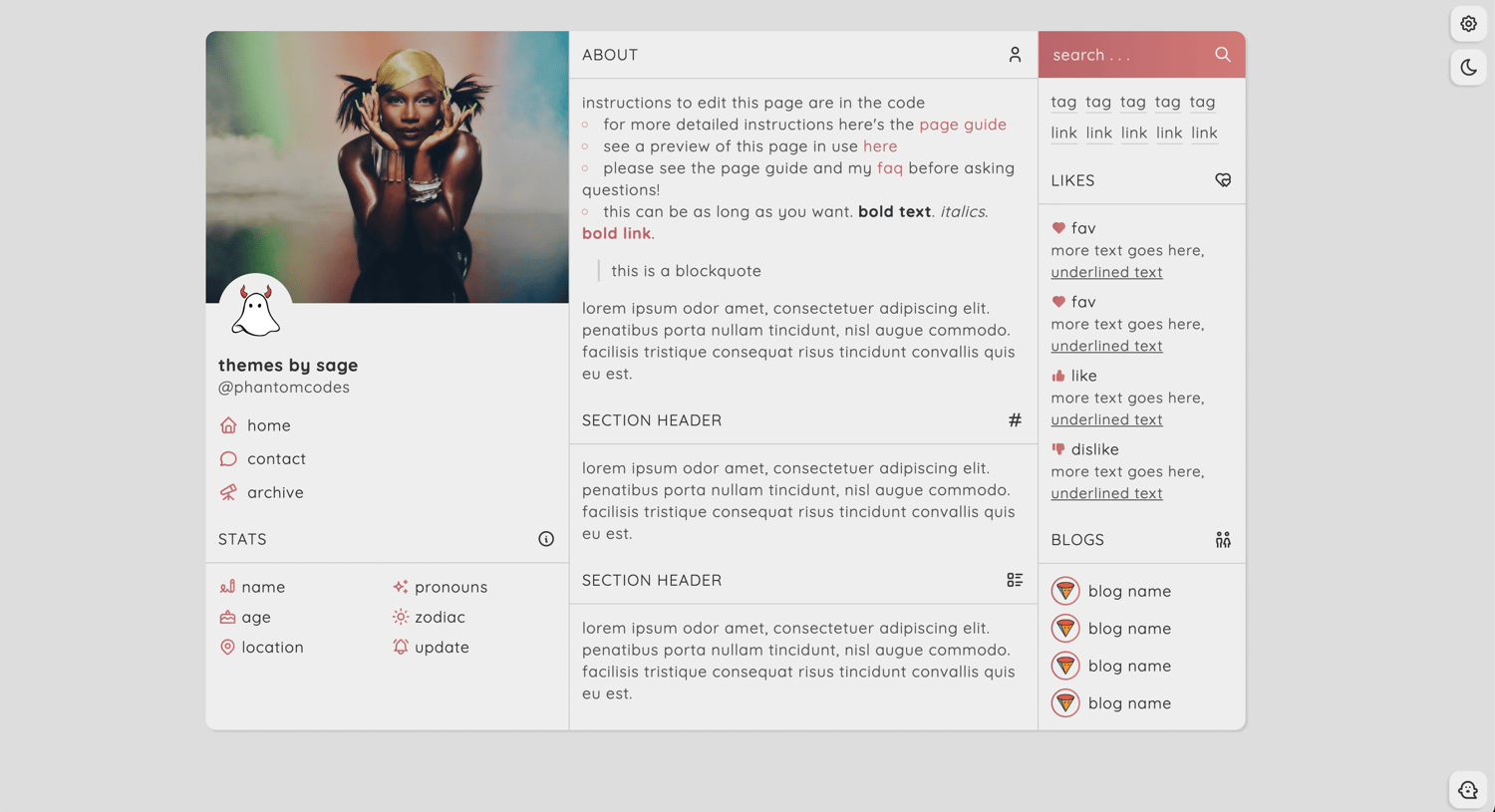 - first column with an image, blog icon/title/url, home/ask/archive links, and info stats