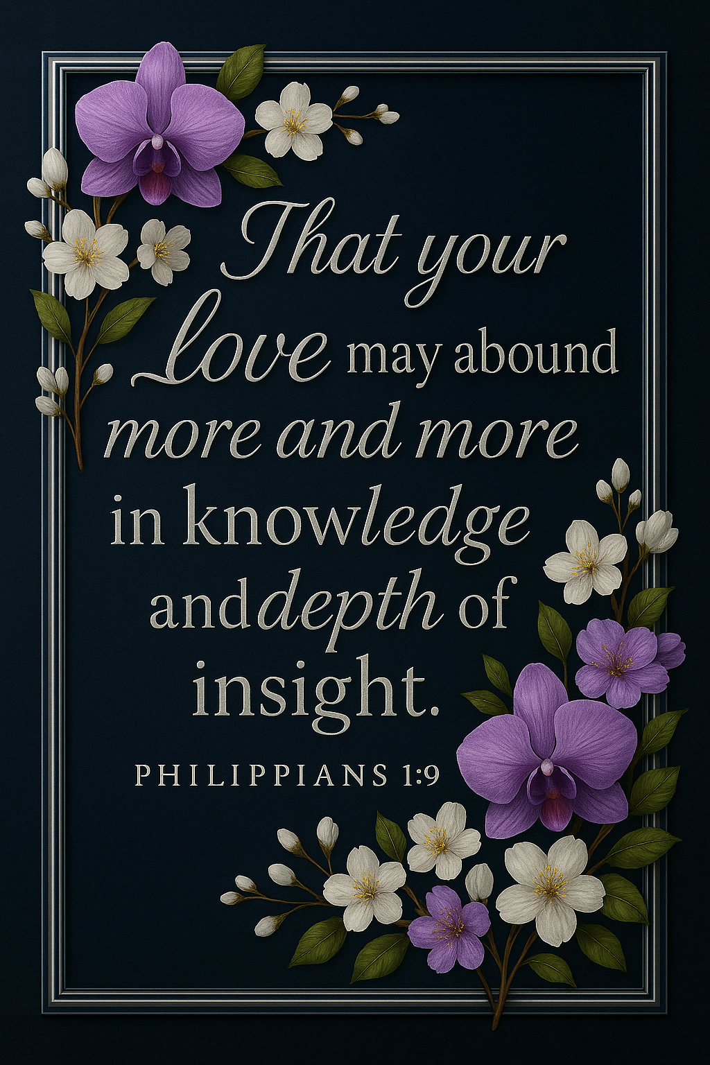 Celebrate deepening love with this Christian wall art featuring Philippians 1:9. Designed with a dark background, elegant gold script, purple orchids, and white blossoms, this printable affirms that love should grow in knowledge and depth of insight. Perfect for weddings, ministry kits, and devotional spaces.