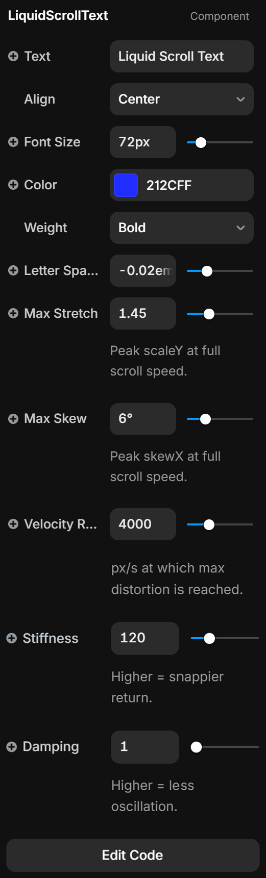 Transform static typography into a living, breathing experience. This component uses real-time physics to detect how fast a user is browsing your site. As they scroll, the text 'liquifies' and stretches, creating a high-end, cinematic feel found on award-winning agency portfolios. It’s not just a scroll effect; it’s a physical response to user intent.