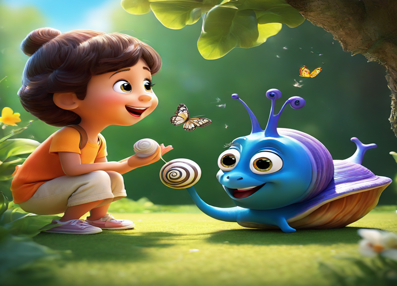 Once upon a time, in a lush green garden, there lived a snail named Sniffles. Sniffles had a shiny shell, bright green eyes, and a heart full of curiosity. While his friends, Wings the Butterfly and Gusty the Bird, flew freely in the sky, Sniffles could only dream of soaring through the air. Every night, as Sniffles settled down in his cozy little corner, he would gaze at the twinkling stars, imagining what it would be like to have wings
