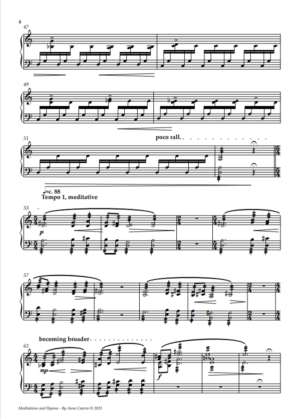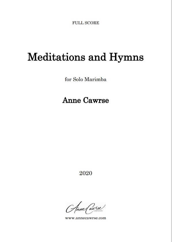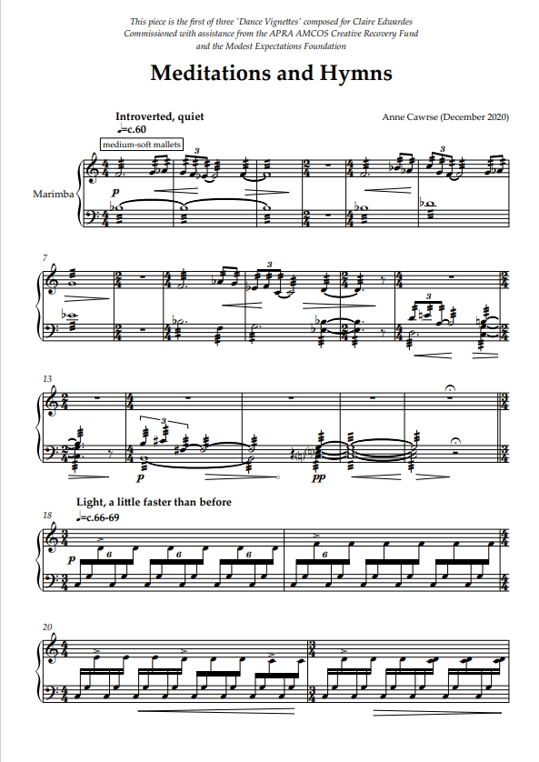 Meditations and Hymns for solo marimba is a contemplative and gentle exploration of a simple melodic line, repeated in varying harmonic and textural contexts through arch form (ABCBA). It is the first work in Dance Vignettes, a set of three marimba solos composed over the Summer of 2020-21 for Australian percussionist Claire Edwardes.
