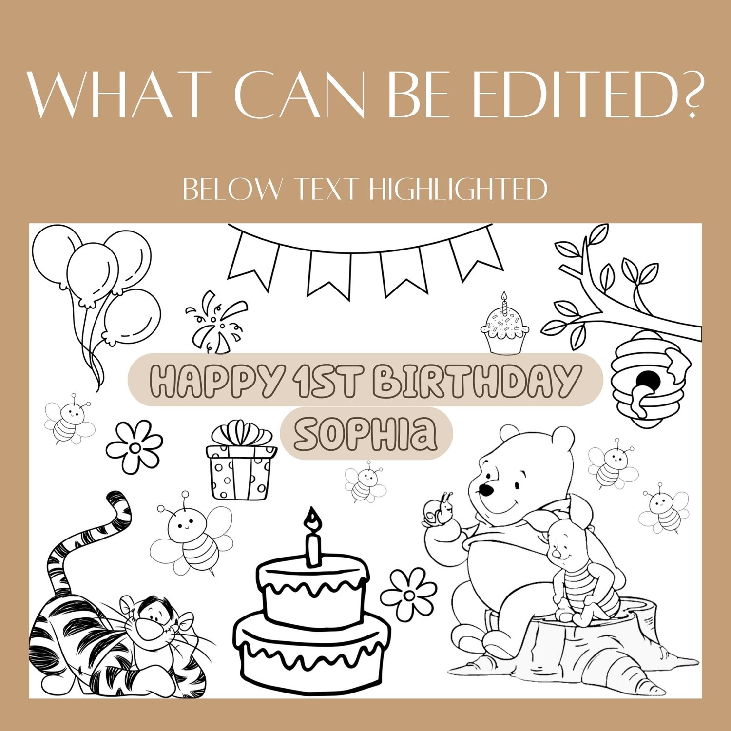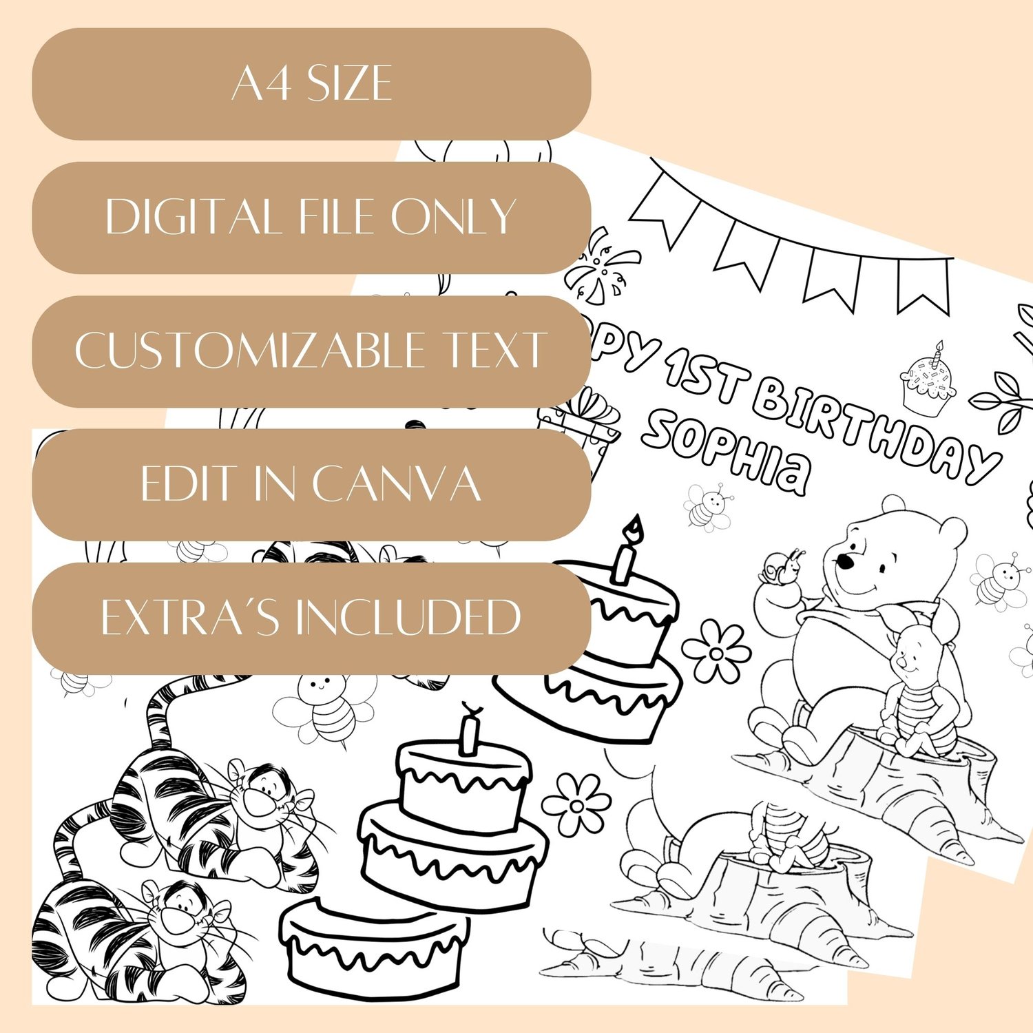 Add sweetness and creativity to your child’s birthday with our Winnie the Pooh–Themed Birthday Coloring Activity! This printable coloring set is perfect for keeping little guests entertained at birthday parties, playdates, or Pooh-themed events. Featuring adorable designs inspired by Winnie the Pooh and friends like Tigger, Piglet, and Eeyore, these pages make a fun activity and a memorable take-home keepsake. Personalize each coloring page with your child’s name, age, or a special party message for an extra special touch that kids will love! Perfect for Winnie the Pooh birthdays, honey-themed celebrations, or any toddler-friendly event, this customizable coloring activity adds a creative and interactive element to your party.