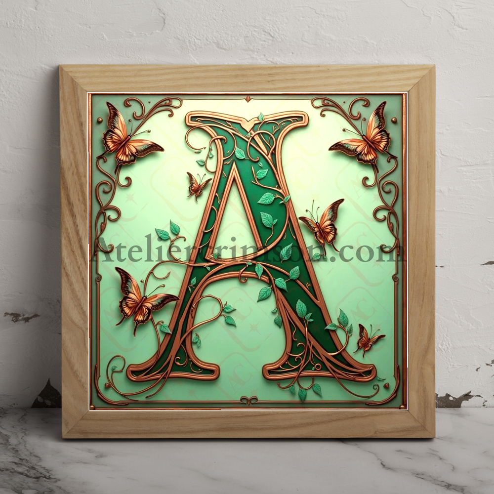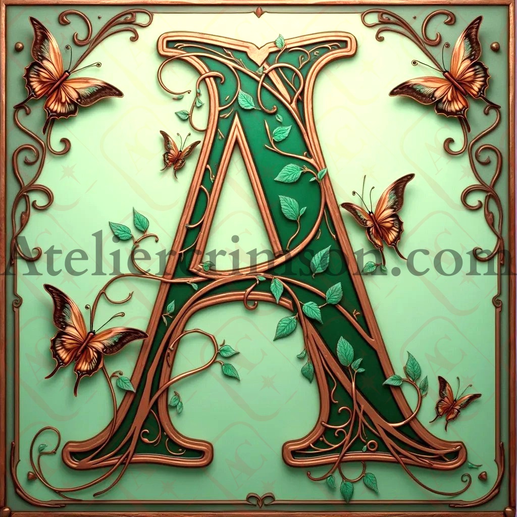 The letter A emerald and copper Art Nouveau Intricate design with floral patterns, butterflies, and vines. Elegant sage green background. Perfect for vintage lovers and typography enthusiasts.
