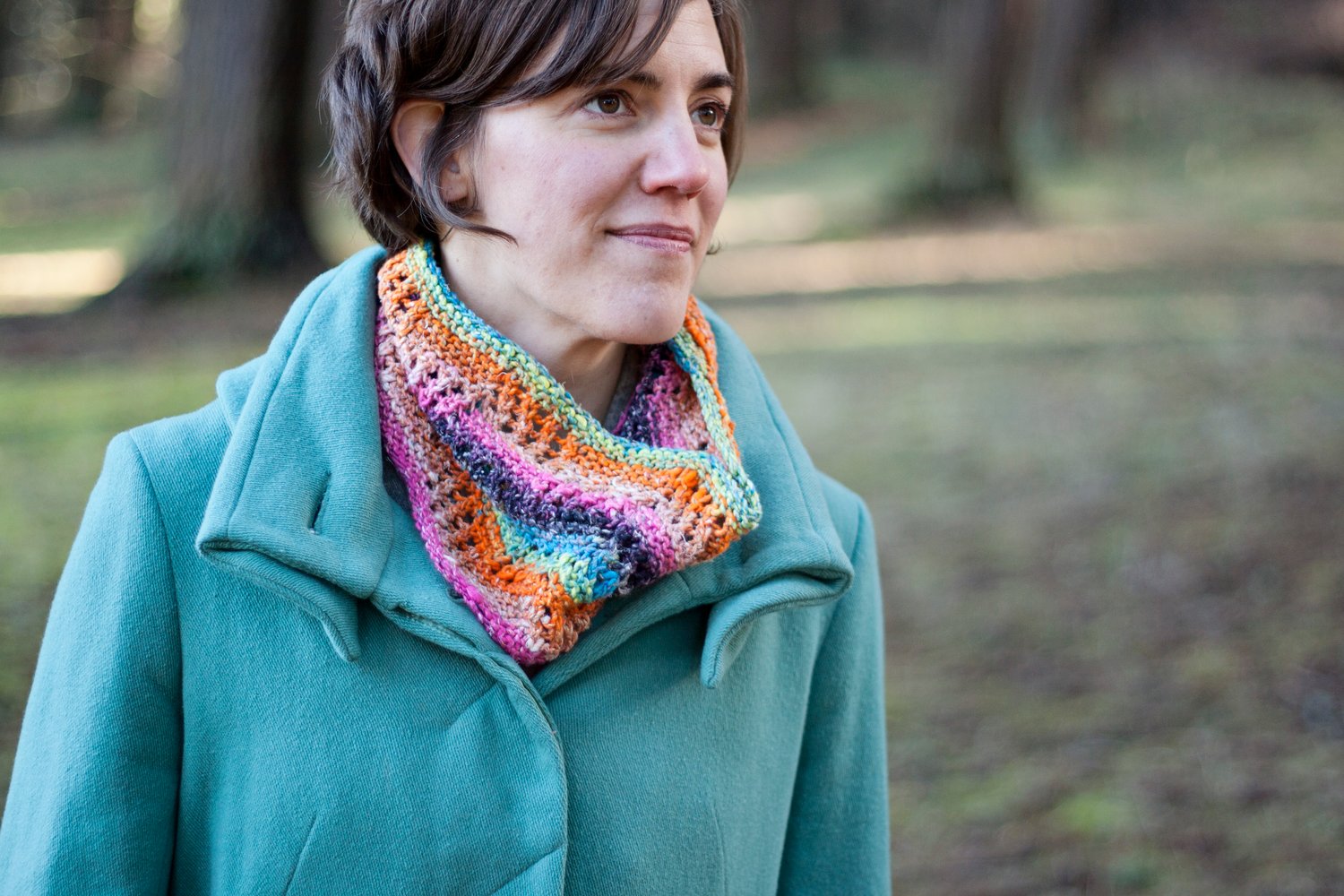The alternating blocks of k2tog and ssk lace blocks in this cowl pull the fabric alternately to the right and the left, which gives it the ripple effect when knit up in a striped yarn. The lace itself is particularly simple to work, with only two true patterned rows.