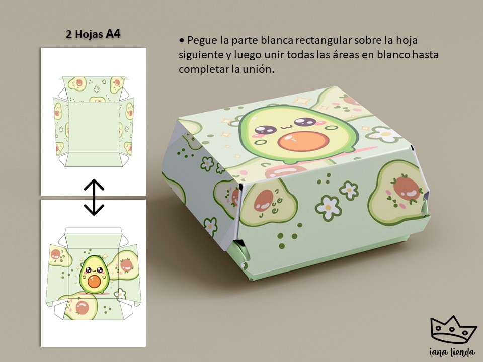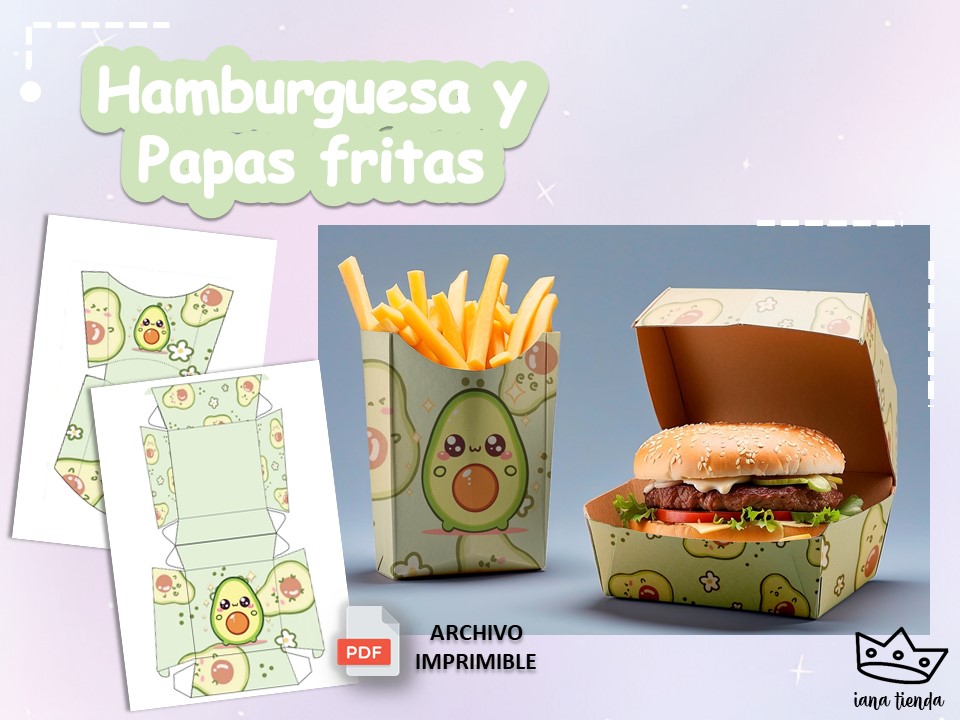 Esta plantilla incluye un adorable diseño de una Palta Kawaii, ideal para armar una cajita temática de hamburguesa y papas fritas. Perfecta para fiestas, celebraciones infantiles o para darle un toque especial y divertido a tus comidas.