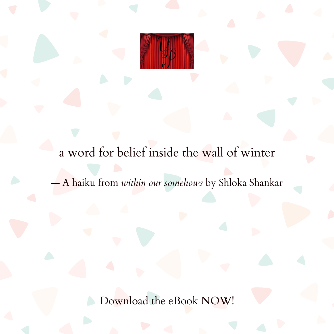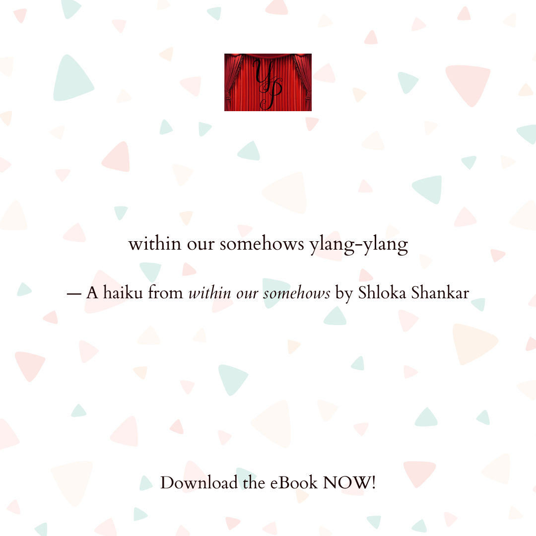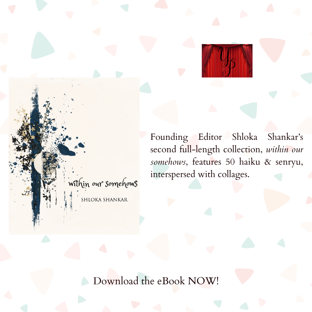 Shloka Shankar is a poet, editor, and visual artist from Bangalore, India. A Best of the Net nominee and widely published haiku poet, Shloka is the Founding Editor of Sonic Boom and its imprint Yavanika Press. She is the author of the microchap Points of Arrival (Origami Poems, 2021), the haiku collection The Field of Why (Yavanika Press, 2022), and co-author of the haiga anthology, living in the pause (Yavanika Press, 2024).