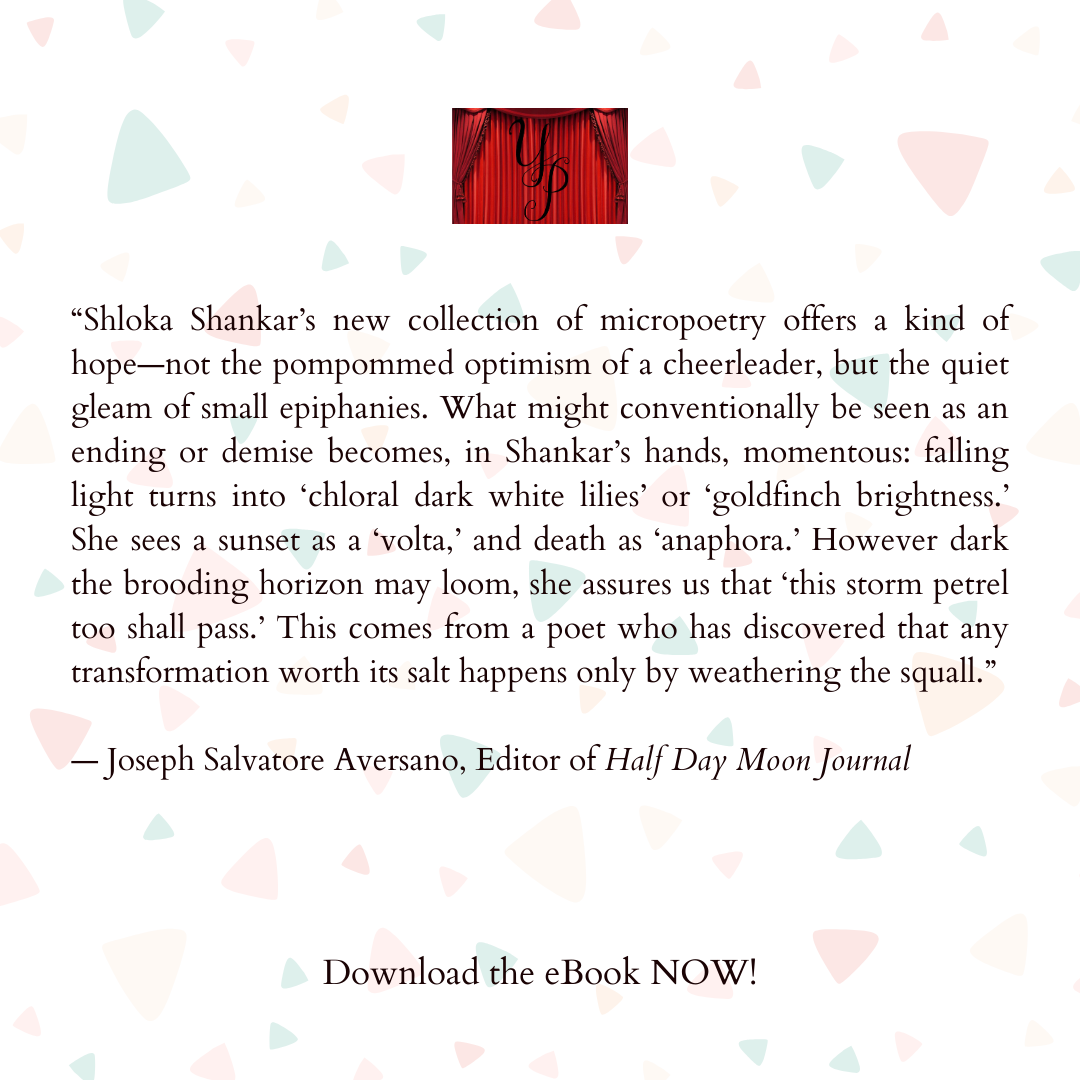 “Shloka Shankar’s new collection of micropoetry offers a kind of hope—not the pompommed optimism of a cheerleader, but the quiet gleam of small epiphanies. What might conventionally be seen as an ending or demise becomes, in Shankar’s hands, momentous: falling light turns into ‘chloral dark white lilies’ or ‘goldfinch brightness.’ She sees a sunset as a ‘volta,’ and death as ‘anaphora.’ However dark the brooding horizon may loom, she assures us that ‘this storm petrel too shall pass.’ This comes from a poet who has discovered that any transformation worth its salt happens only by weathering the squall.”