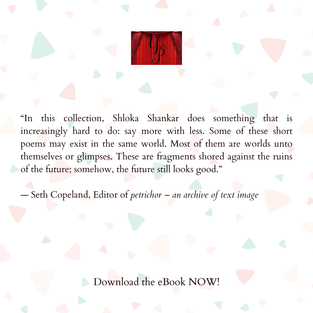 “In this collection, Shloka Shankar does something that is increasingly hard to do: say more with less. Some of these short poems may exist in the same world. Most of them are worlds unto themselves or glimpses. These are fragments shored against the ruins of the future; somehow, the future still looks good.”