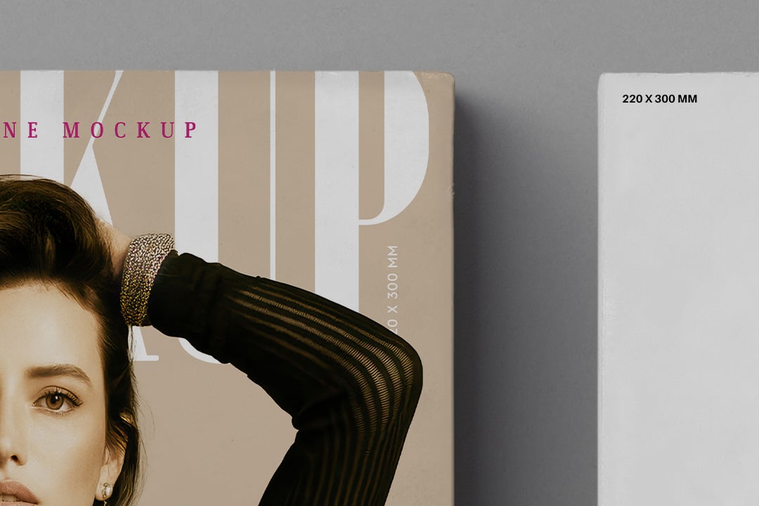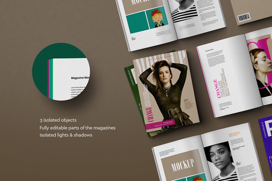 • 3 isolated A4 magazine mockups (front, back, open spread)