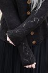 A cozy, worm and woolly cardigan with full length raglan sleeves and geometric lace on the sides and the sleeves.