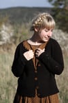 The garment is knit top down seamlessly. The sleeves are worked with raglan increases and have a geometric lace above the cuff. The same lace is worked on the sides of the cardigan. Waist shaping is done in the back.