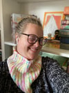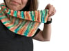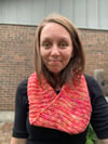I designed this reversible cowl to showcase a special souvenir skein of DK yarn. This project started as a release for the Zombie Knitpocalypse 2020 retreat, an event I cherish every year, filled with friends, laughter, food, knitting, and fun. In these times of physical distancing, you and a friend can make matching cowls with the same or different colorways, and give each other a virtual hug on your next video chat! It is worn close to the neck, as though the piece is giving you a virtual hug. Flip to the reverse or style it upside down for a modified look.